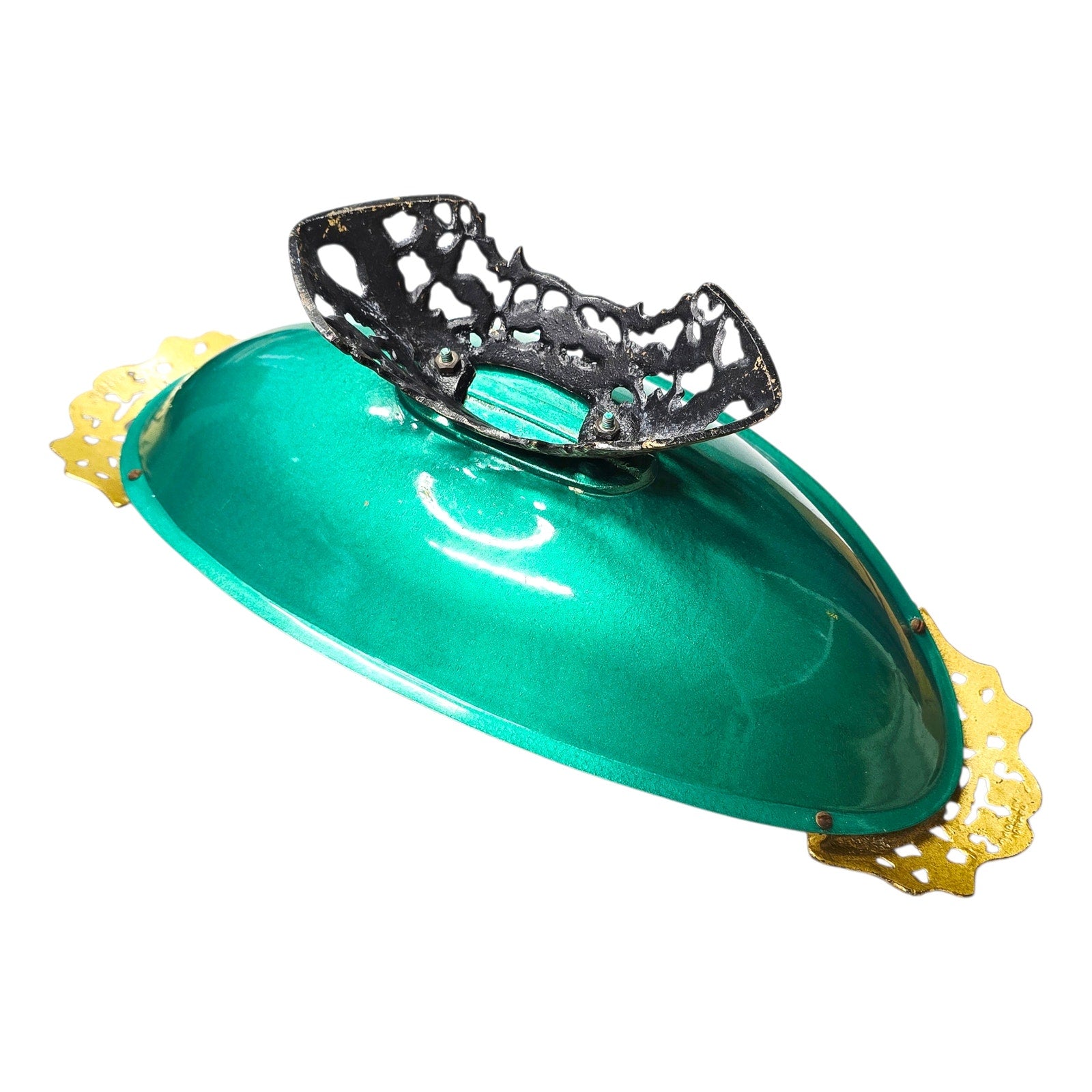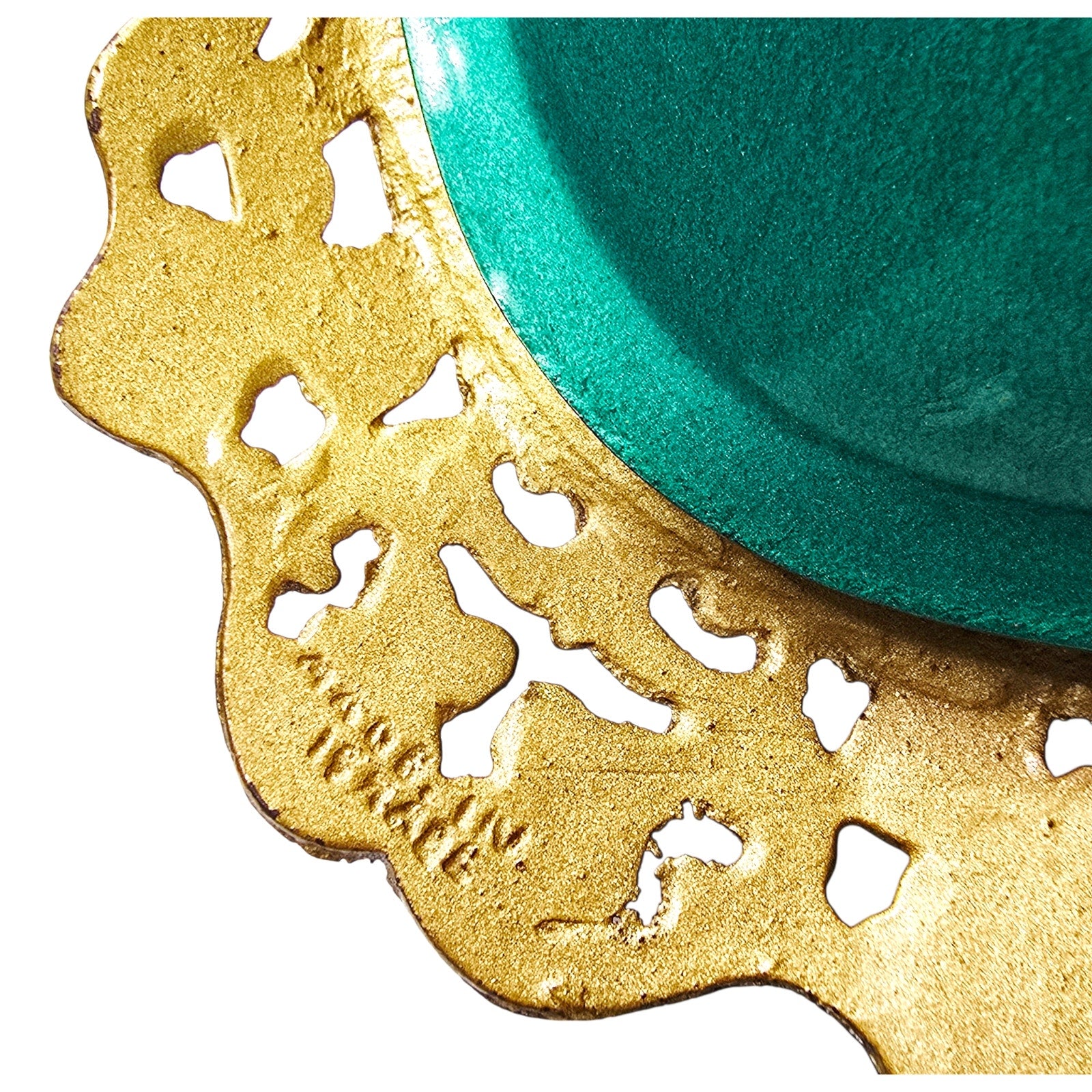 Features: Often includes integrated handles and a "verdigris" or "patina" style finish that combines the warmth of the brass with the vibrant enamel.