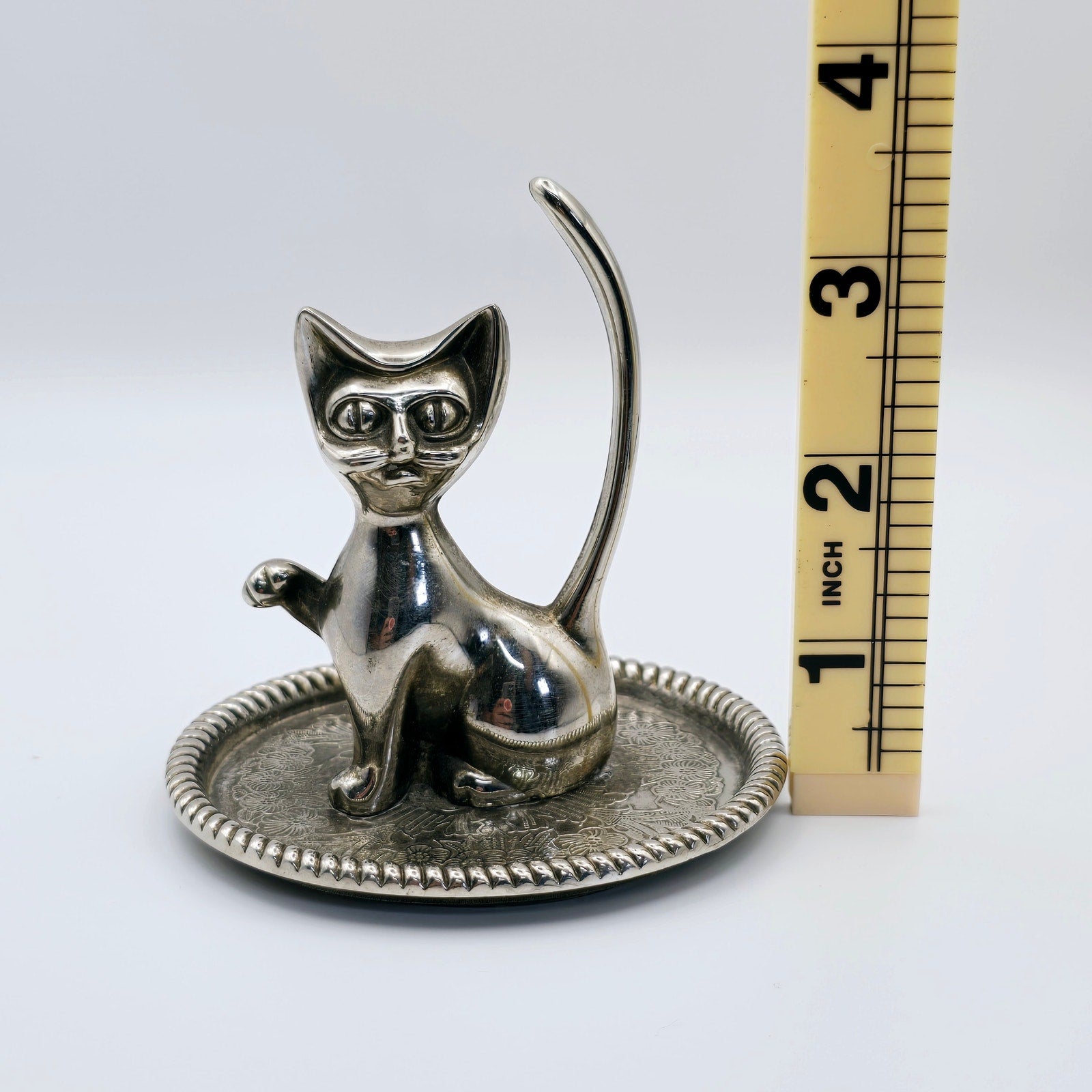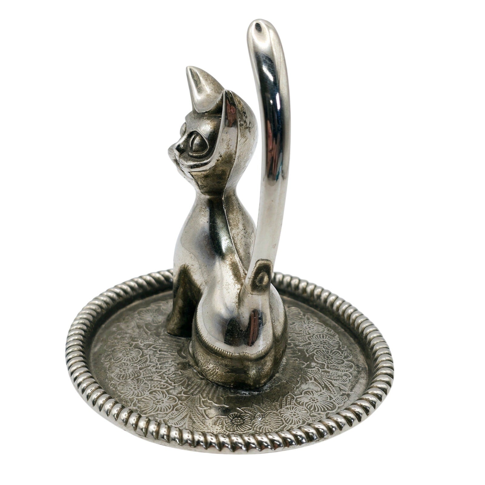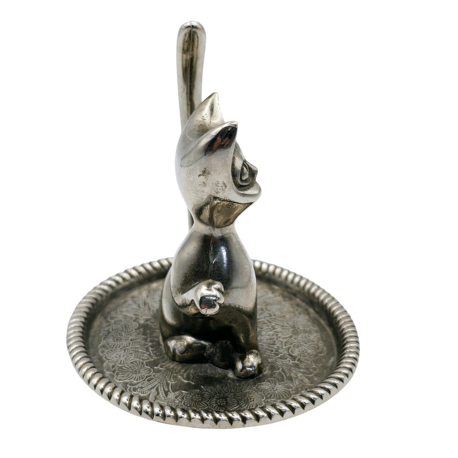 Vintage Silver Plated Cat Ring Holder with Ornate Trinket Underplate