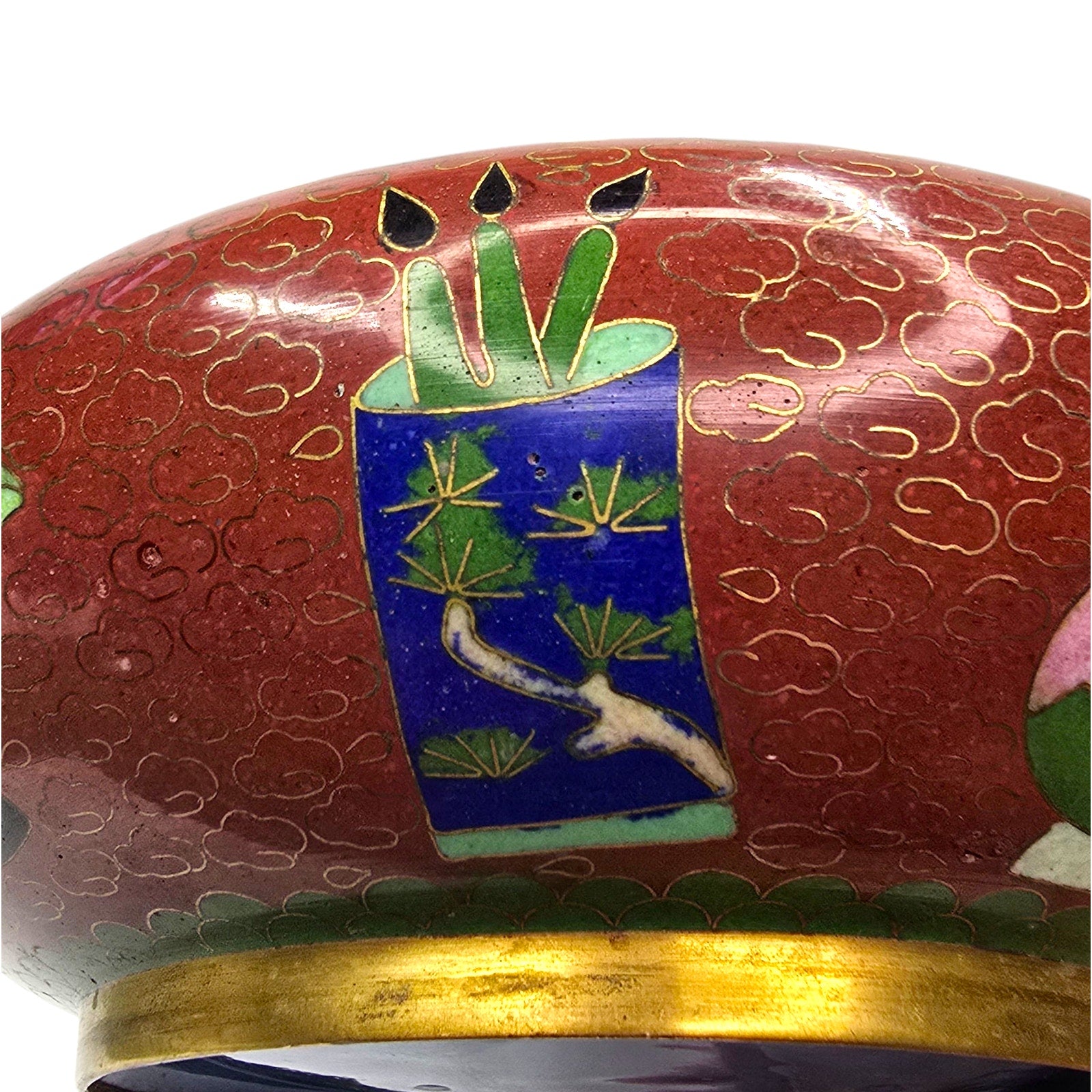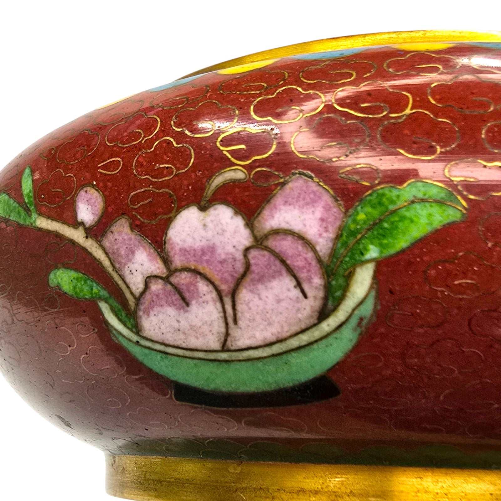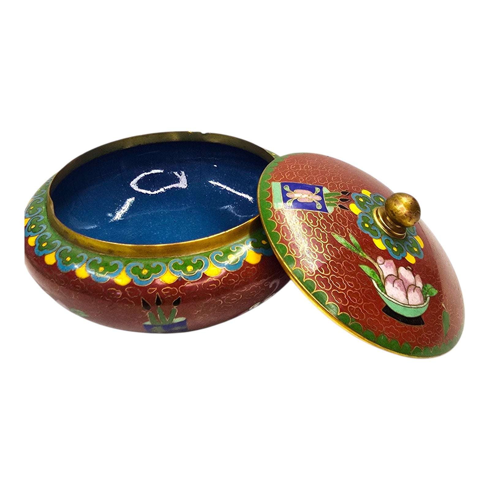 Vintage Chinese cloisonné lidded bowl with red enamel background, lotus floral motifs, and turquoise blue interior. Made of brass with multicolor enamel detailing. Measures approx. 4″ diameter x 2.5″ tall. Attractive collectible or vanity dish display.