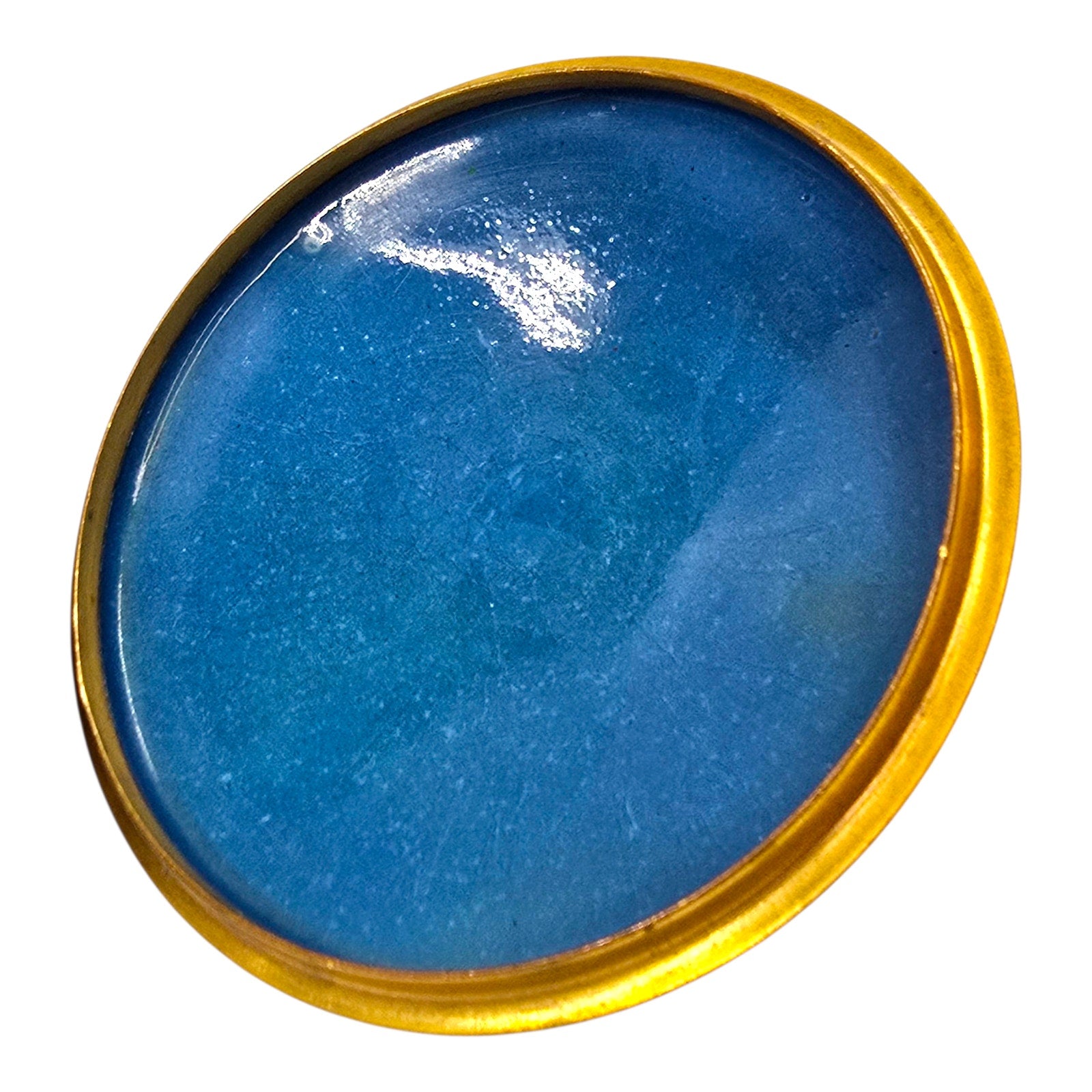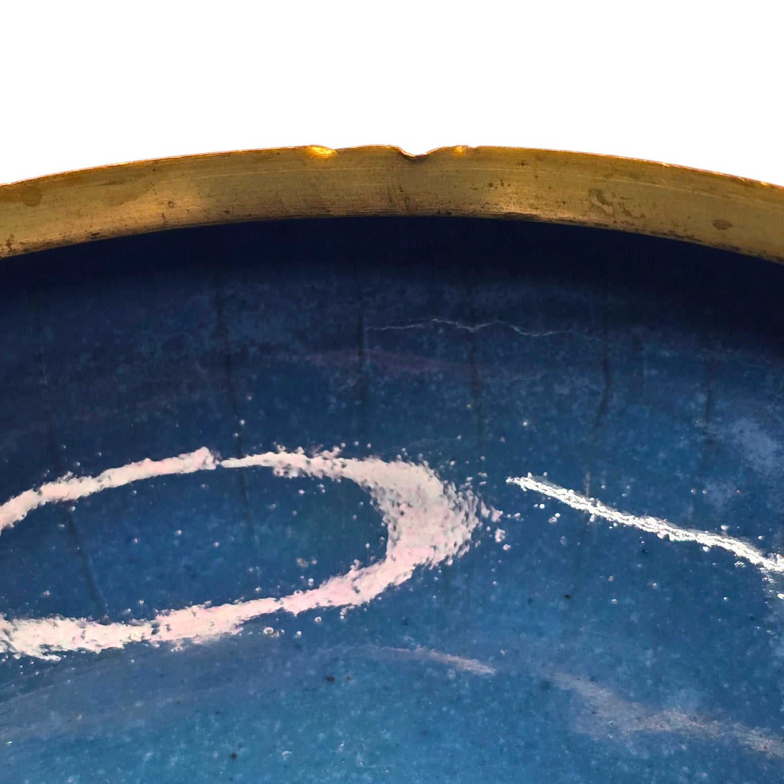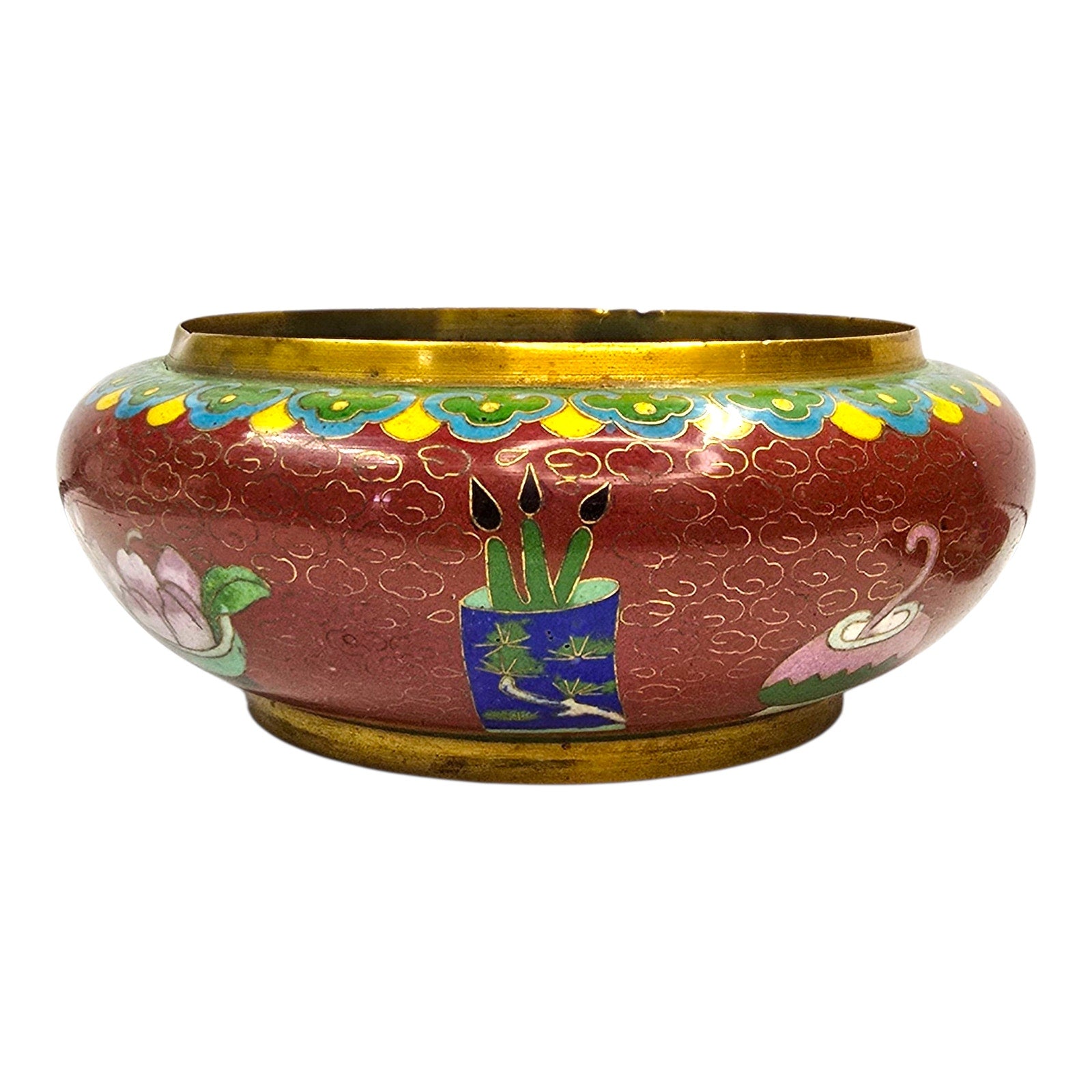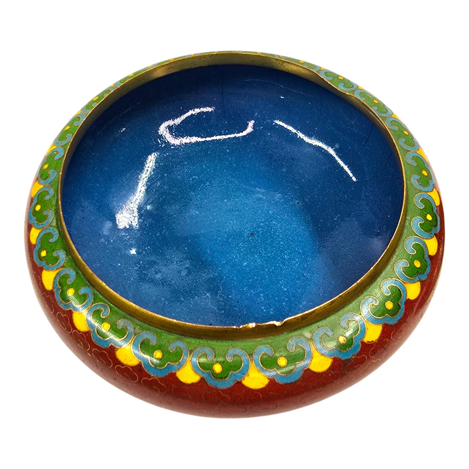 Vintage Chinese cloisonné lidded bowl with red enamel background, lotus floral motifs, and turquoise blue interior. Made of brass with multicolor enamel detailing. Measures approx. 4″ diameter x 2.5″ tall. Attractive collectible or vanity dish display.