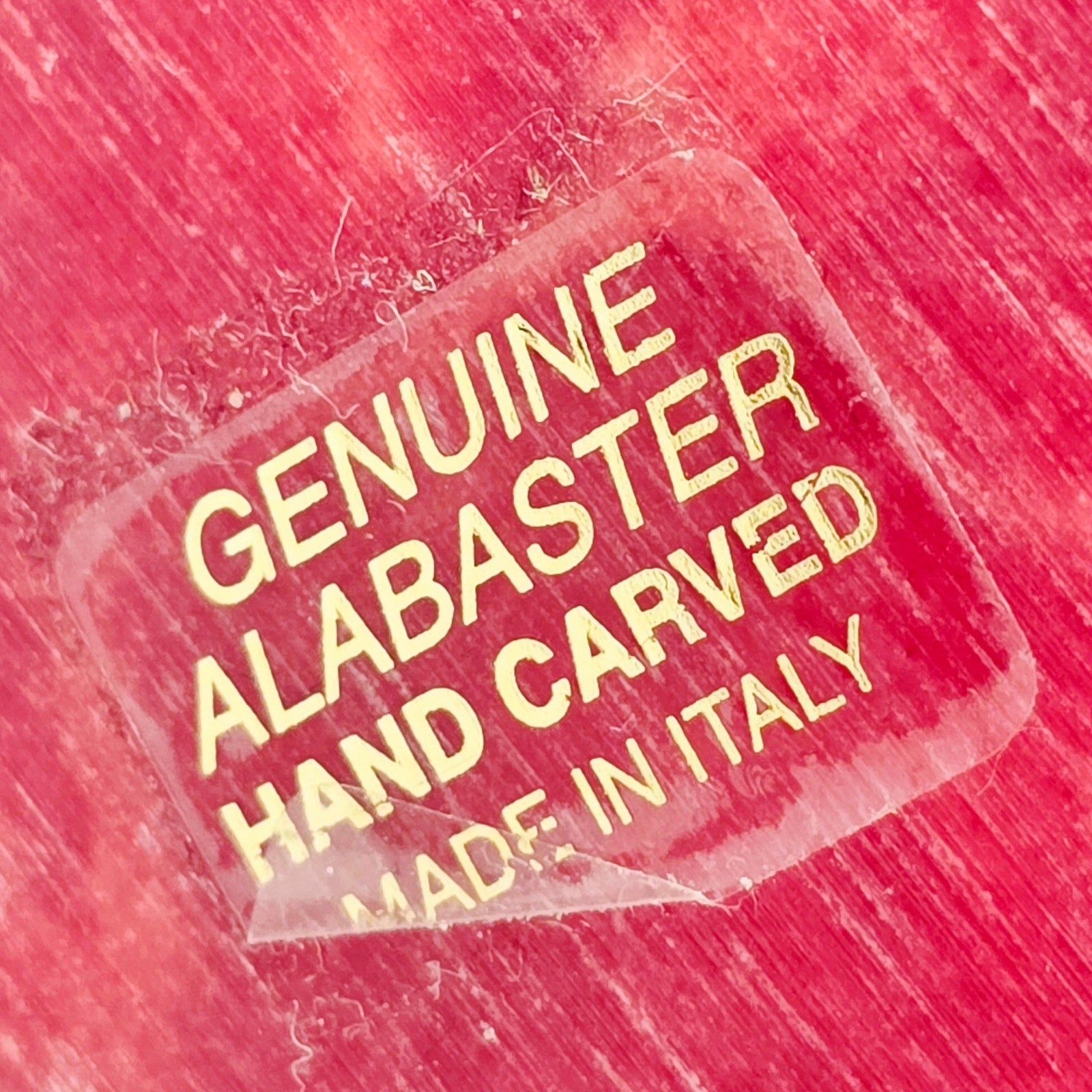 Provenance: Features the original vintage gold-on-red "Genuine Alabaster Hand Carved Made in Italy" label, a hallmark of mid-century Volterra stone production.