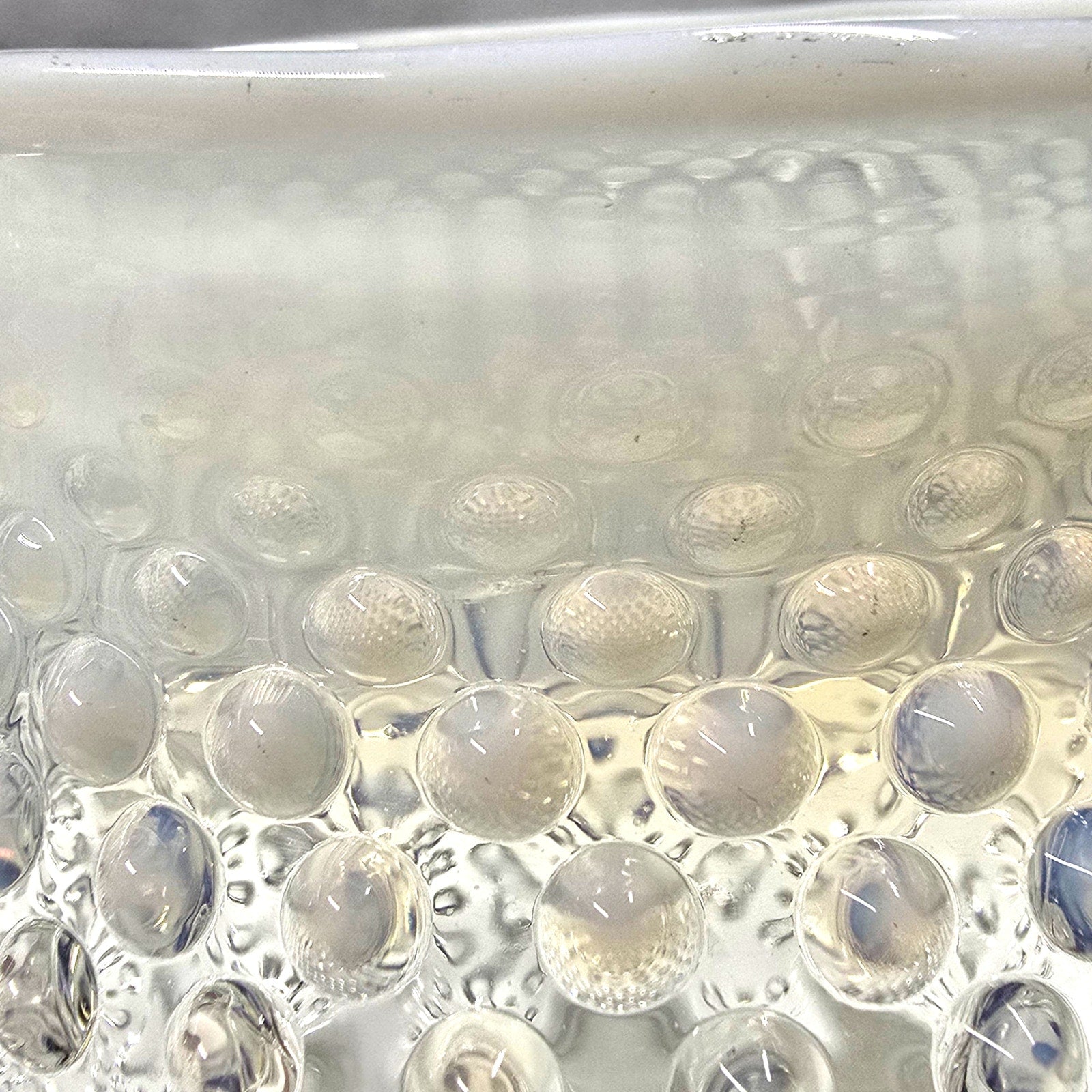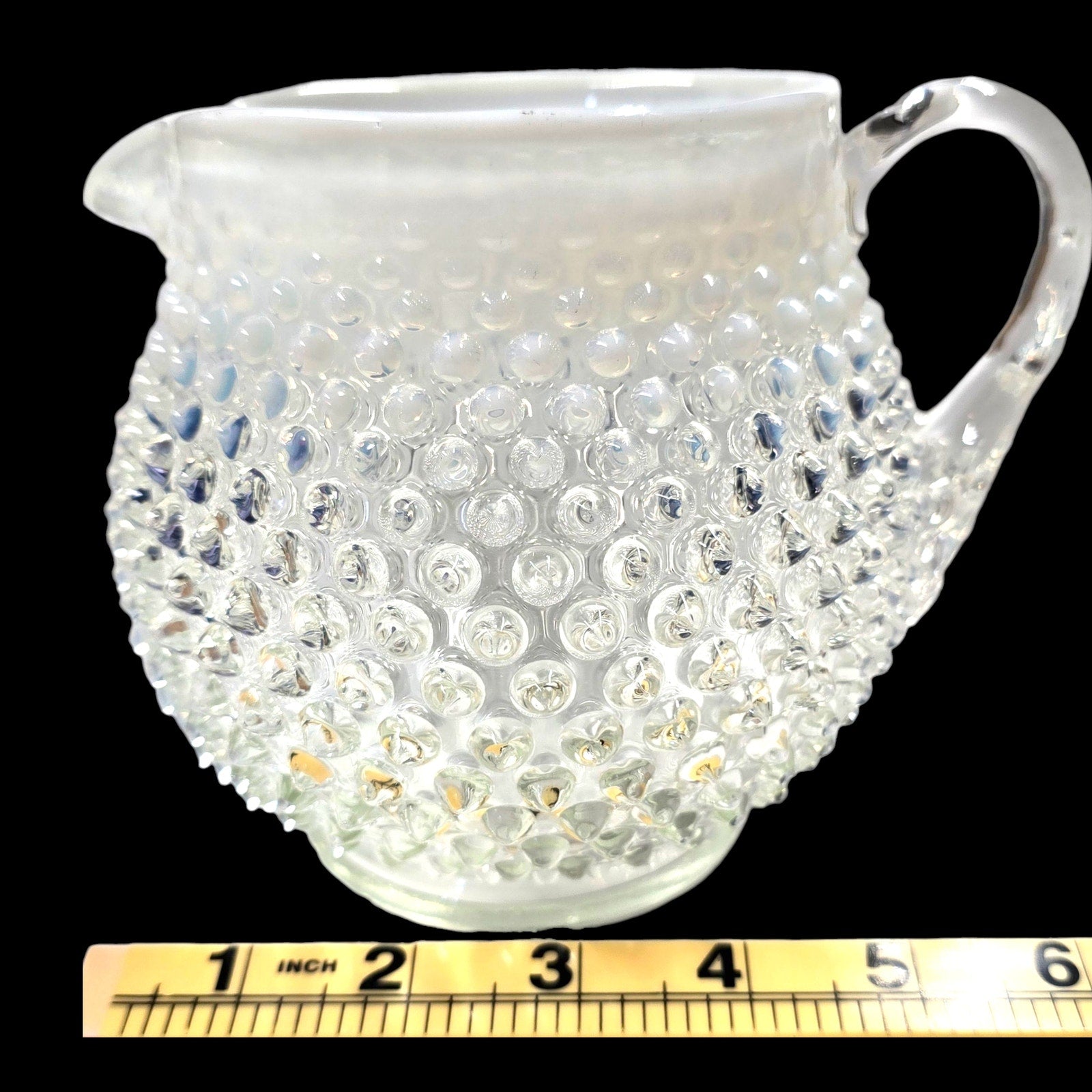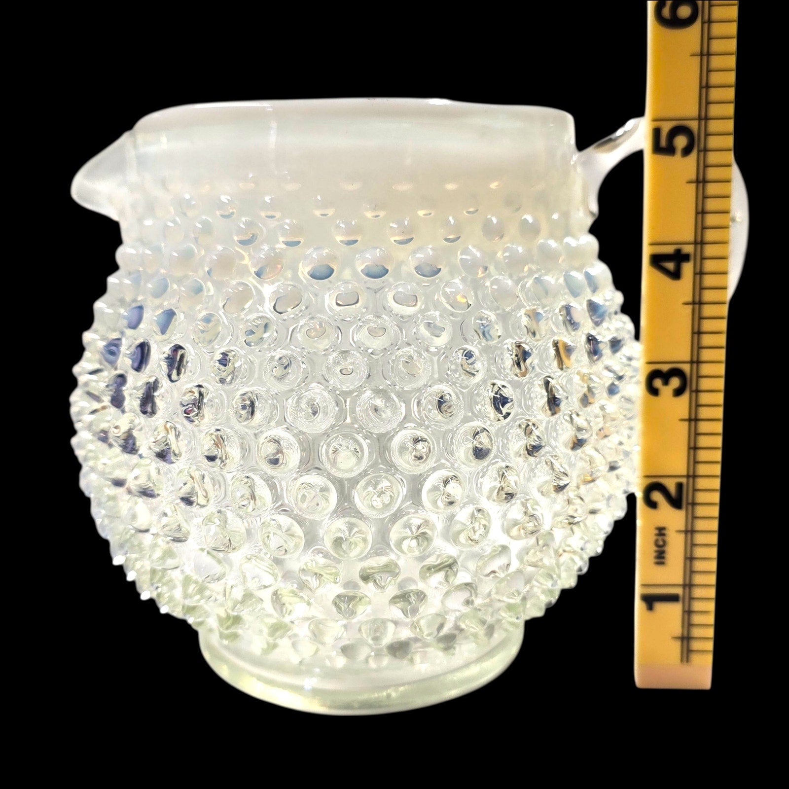Vintage Fenton hobnail milk glass creamer pitcher with opalescent rim. Stands 5.25" tall with 6.5" width and 4" rim diameter. Classic hobnail texture with sturdy applied handle.
