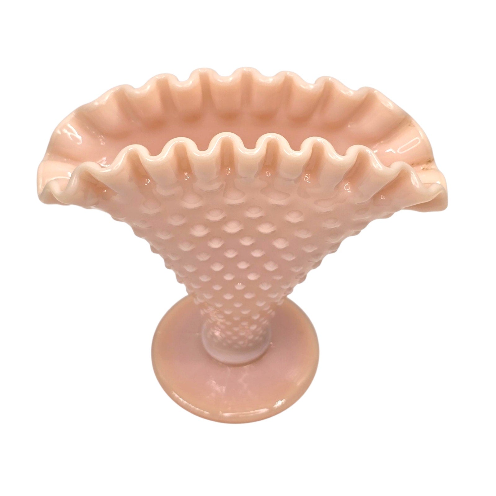 Charming vintage Fenton Pastel Pink Milk Glass Hobnail Fan Vase, approximately 4″ tall × 4.25″ wide.