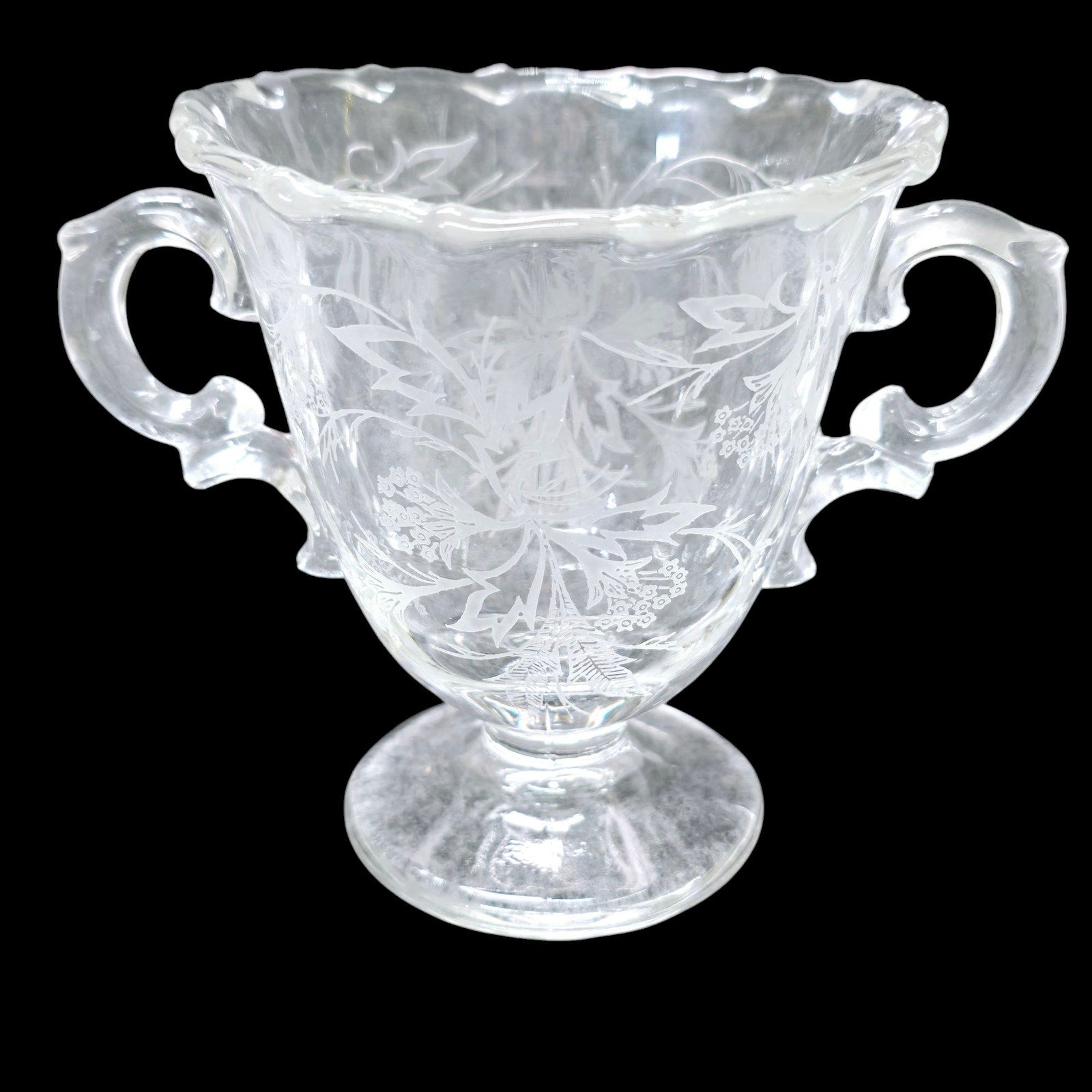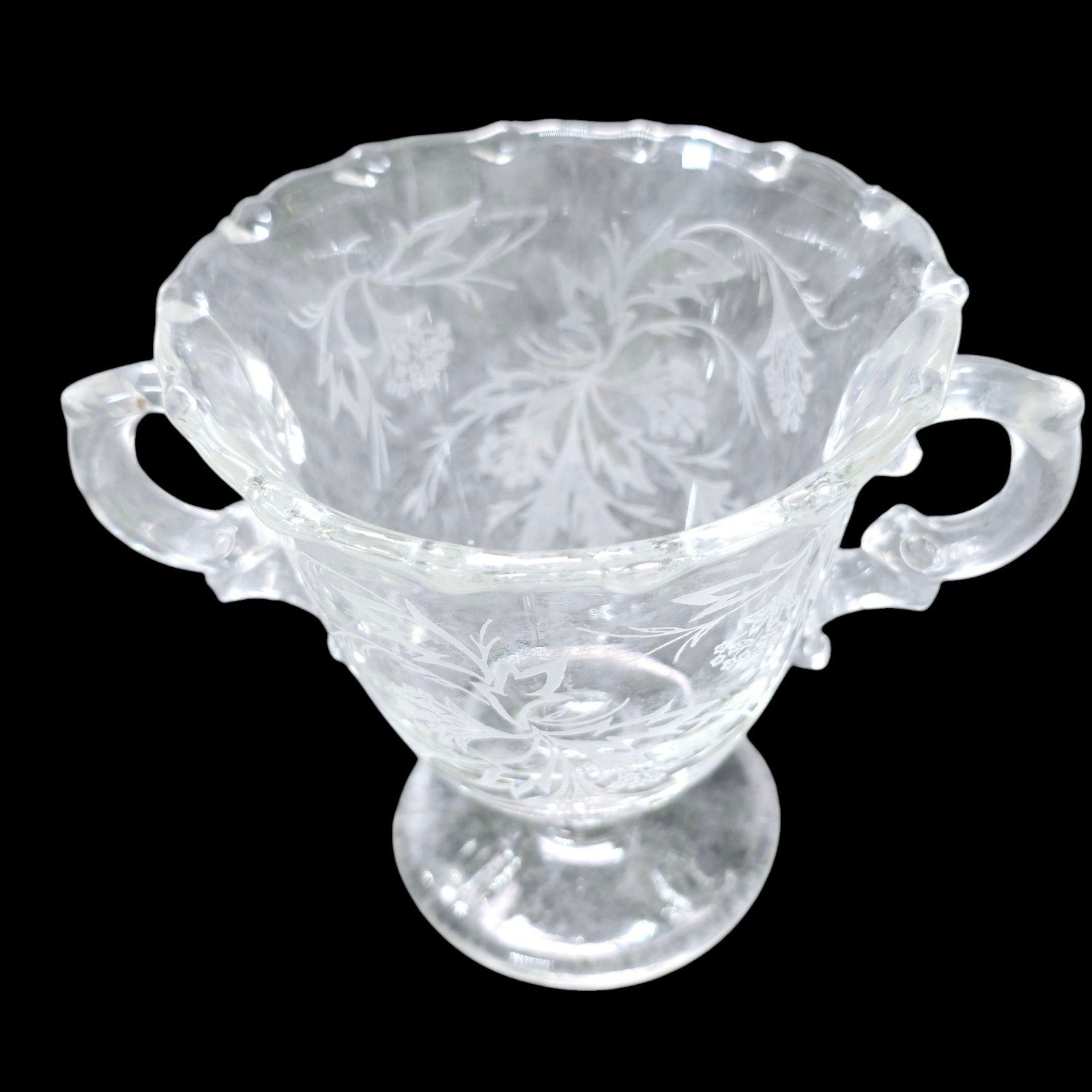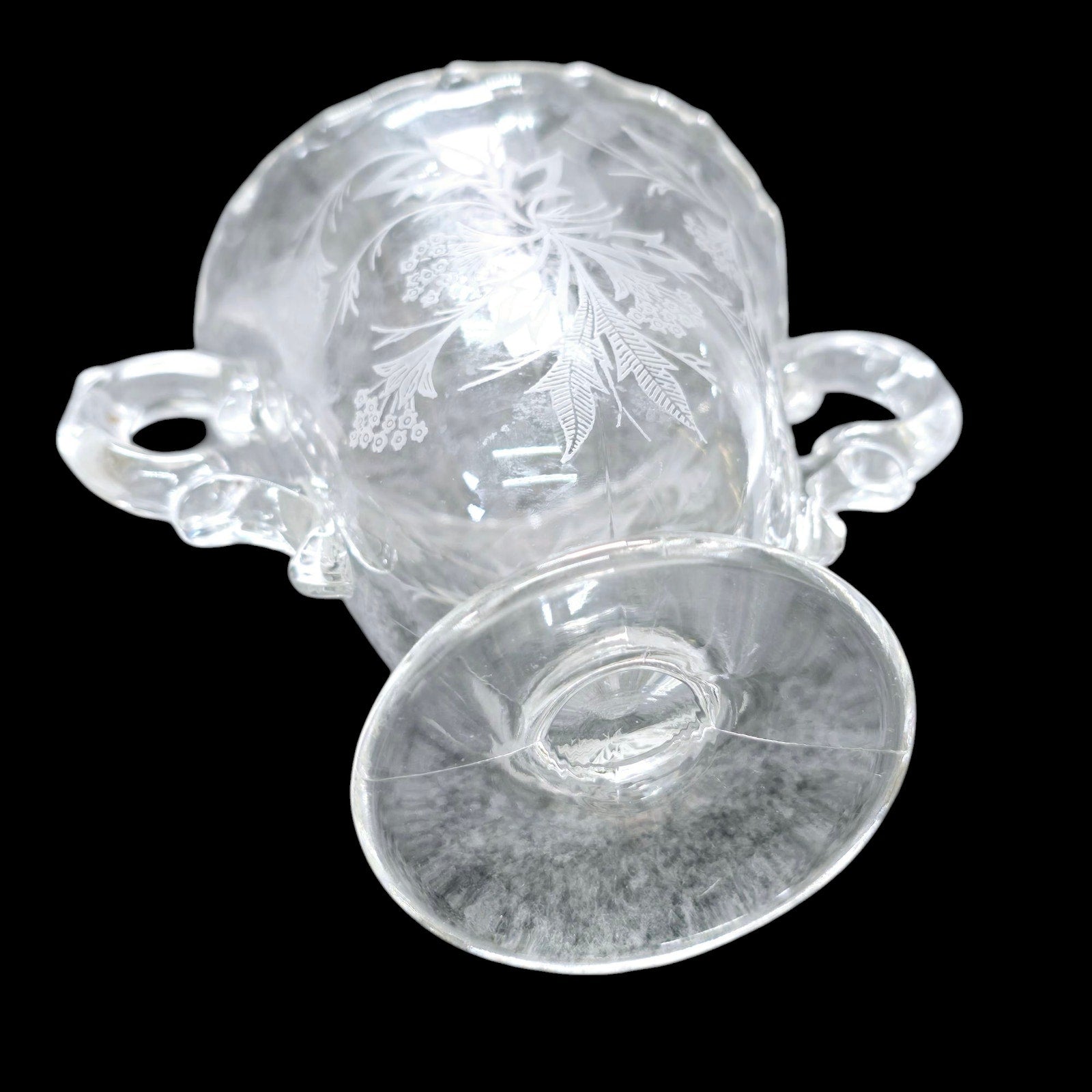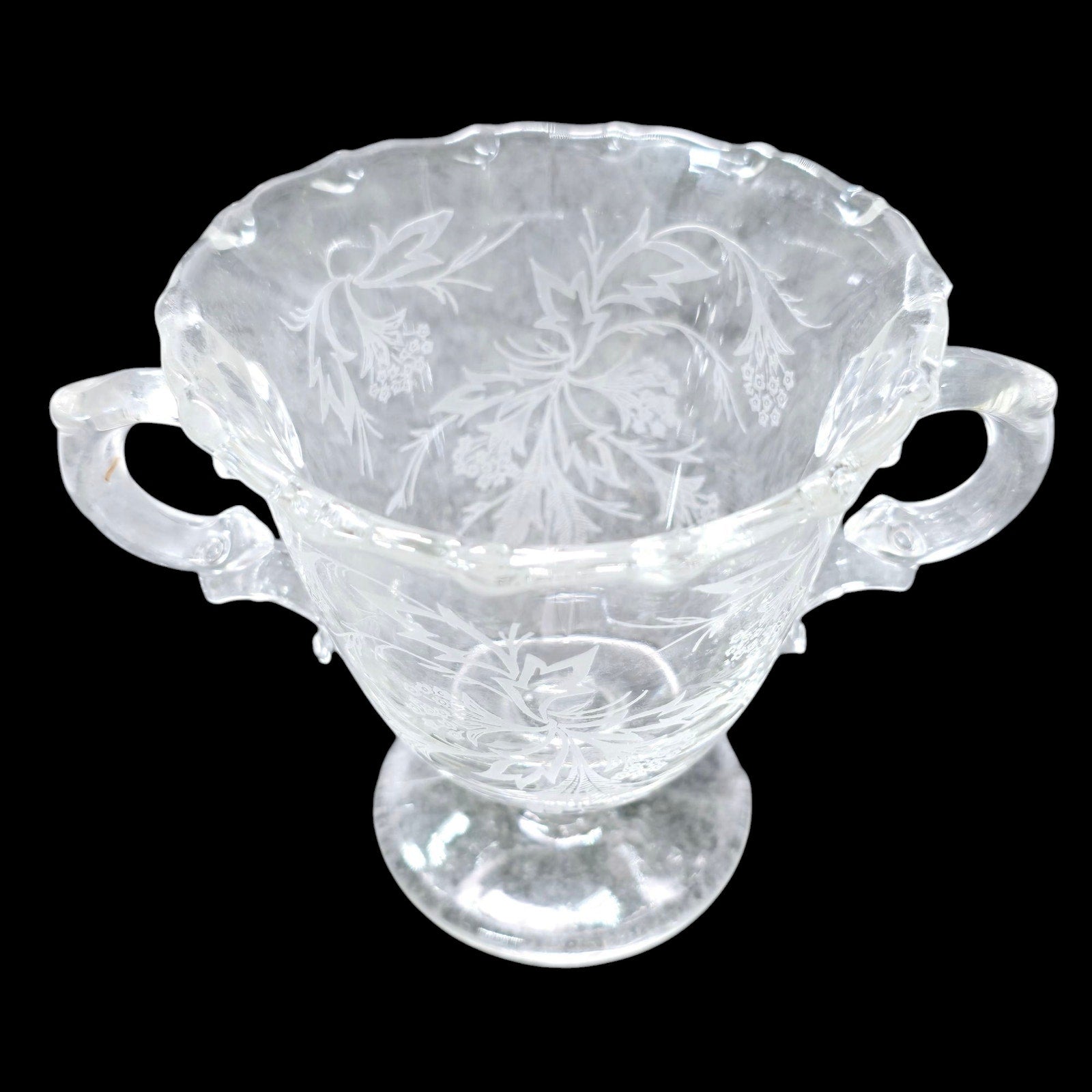 Vtg Fostoria Heather Glass Sugar Jar w/ Handles Baroque Style Floral Leaf Pattern