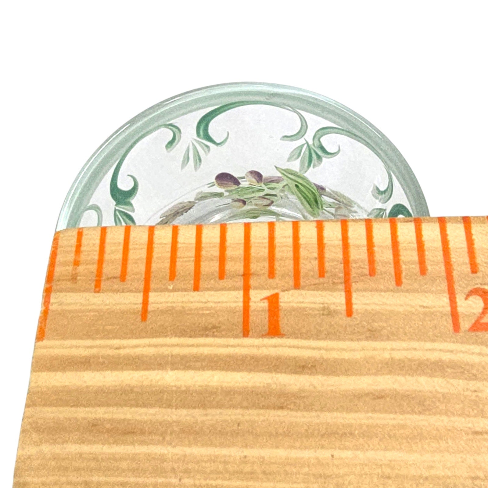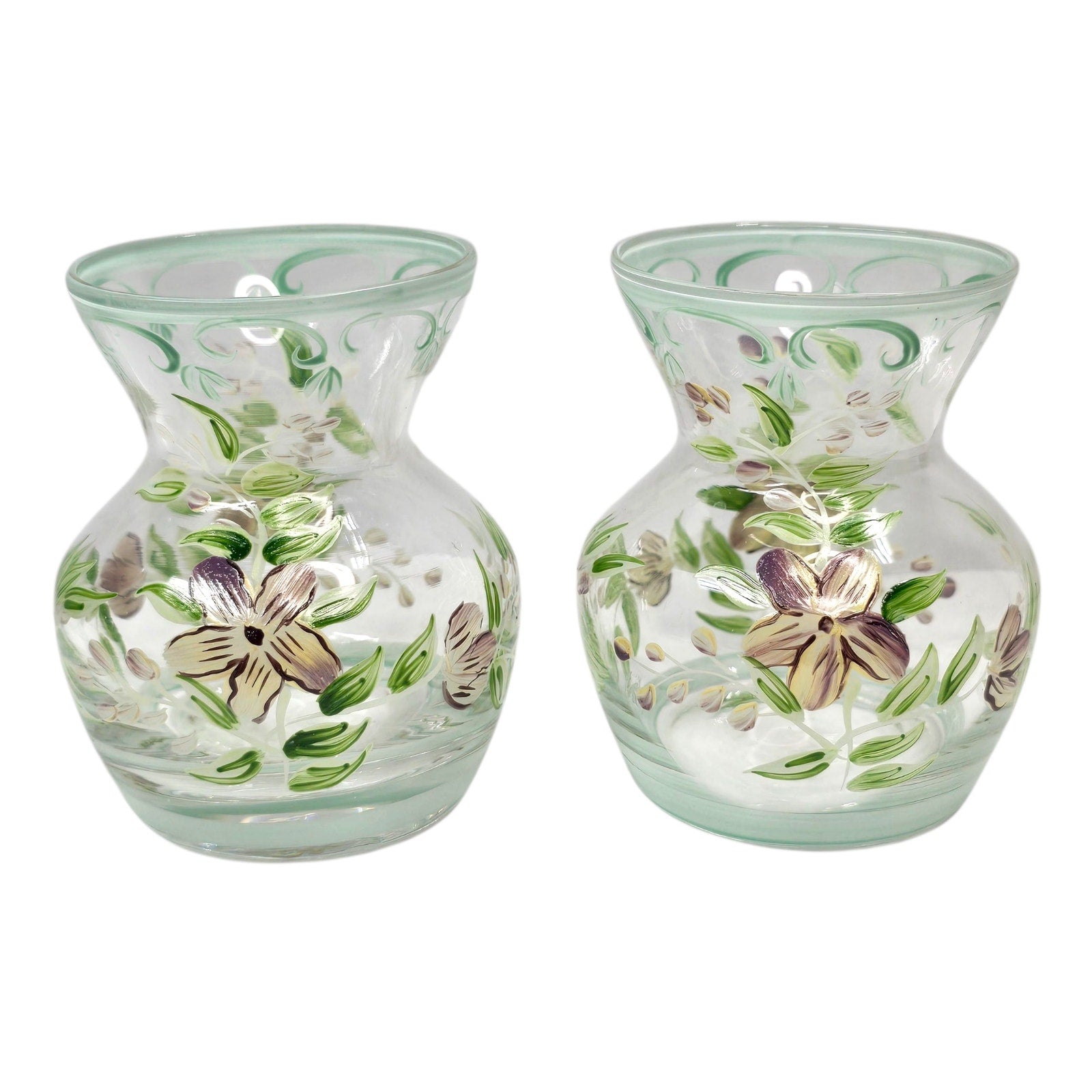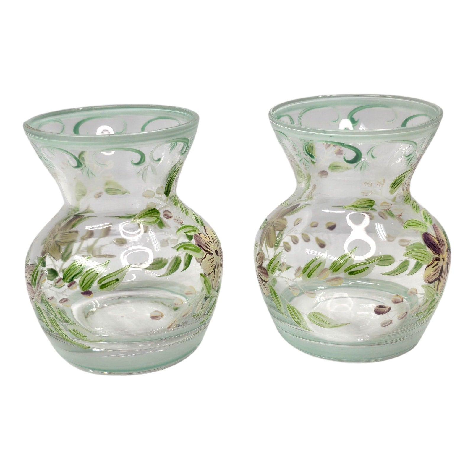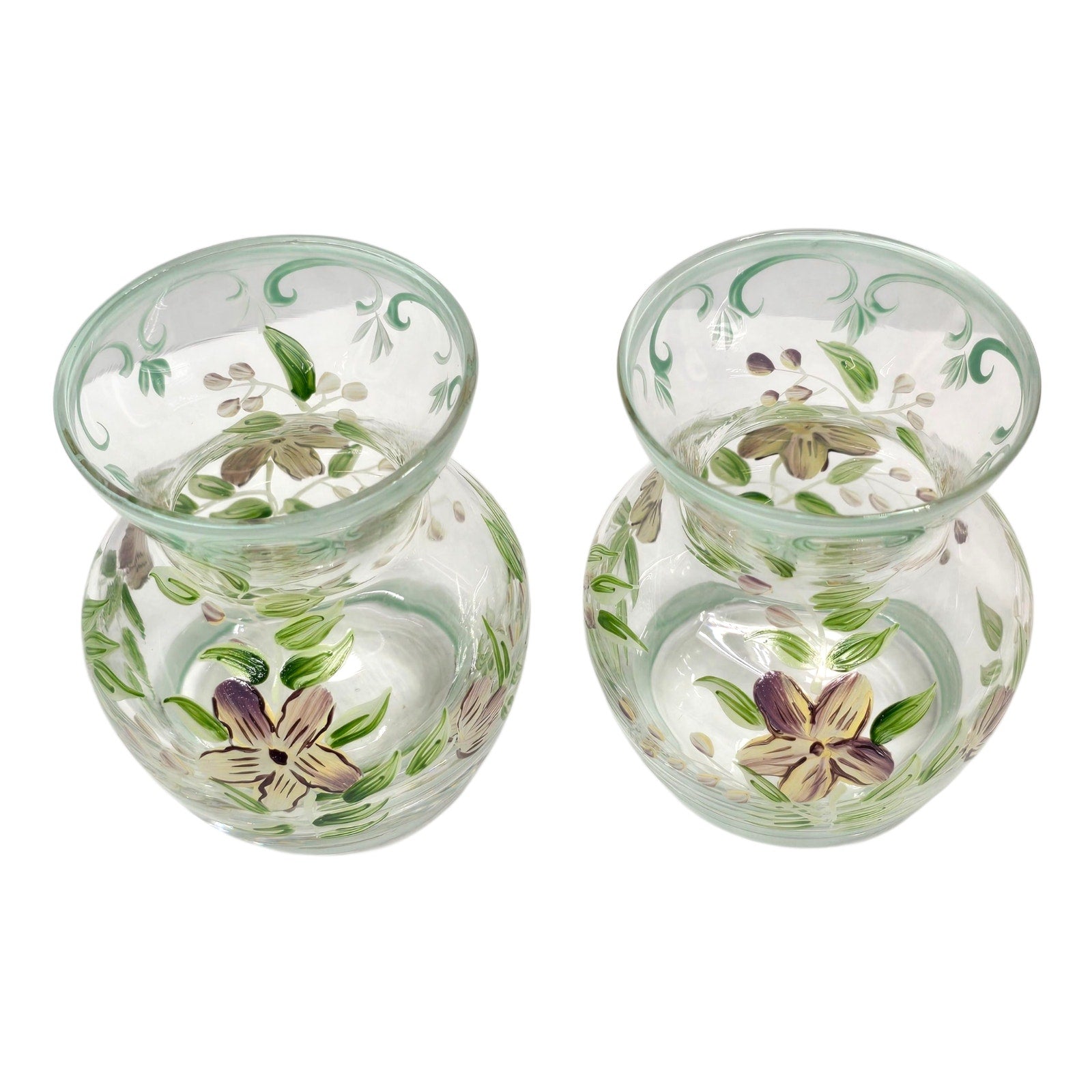 Charming vintage hand-painted glass bud vases featuring soft green rims and delicate floral motifs in lavender, cream, and green. This pair embodies classic cottagecore and shabby chic style — perfect for small blooms, vanity decor, or shelf styling. Lovely accent pieces for farmhouse or French country interiors.