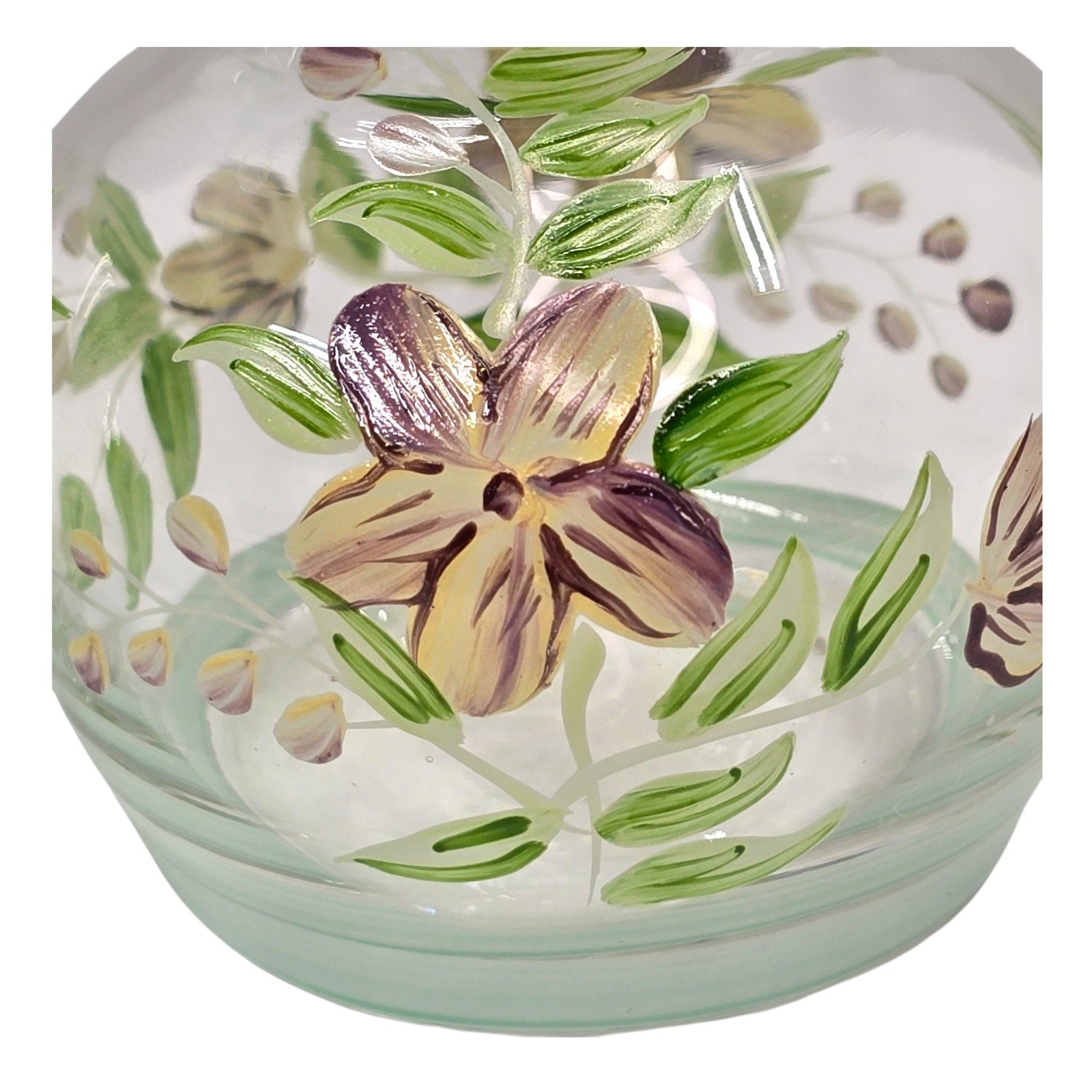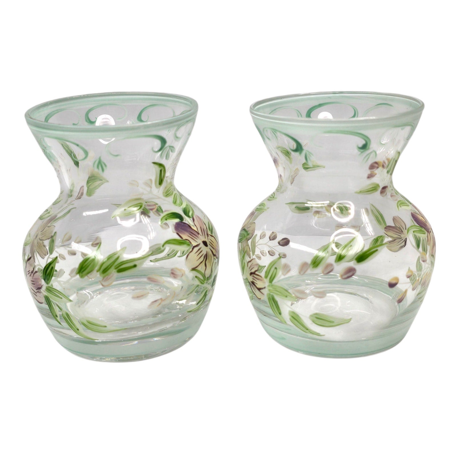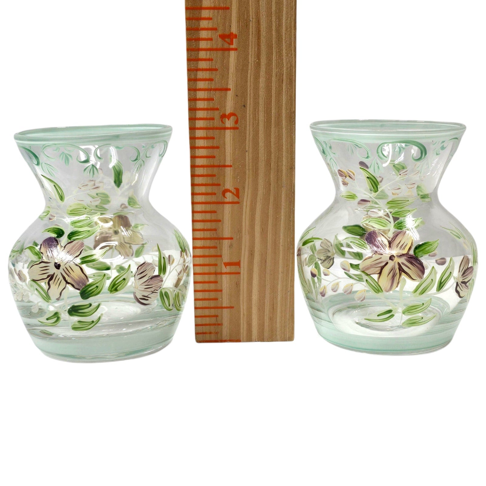 Vtg Hand Painted Floral Glass Vases Lot of 2 Clear Green Trim Small Bud