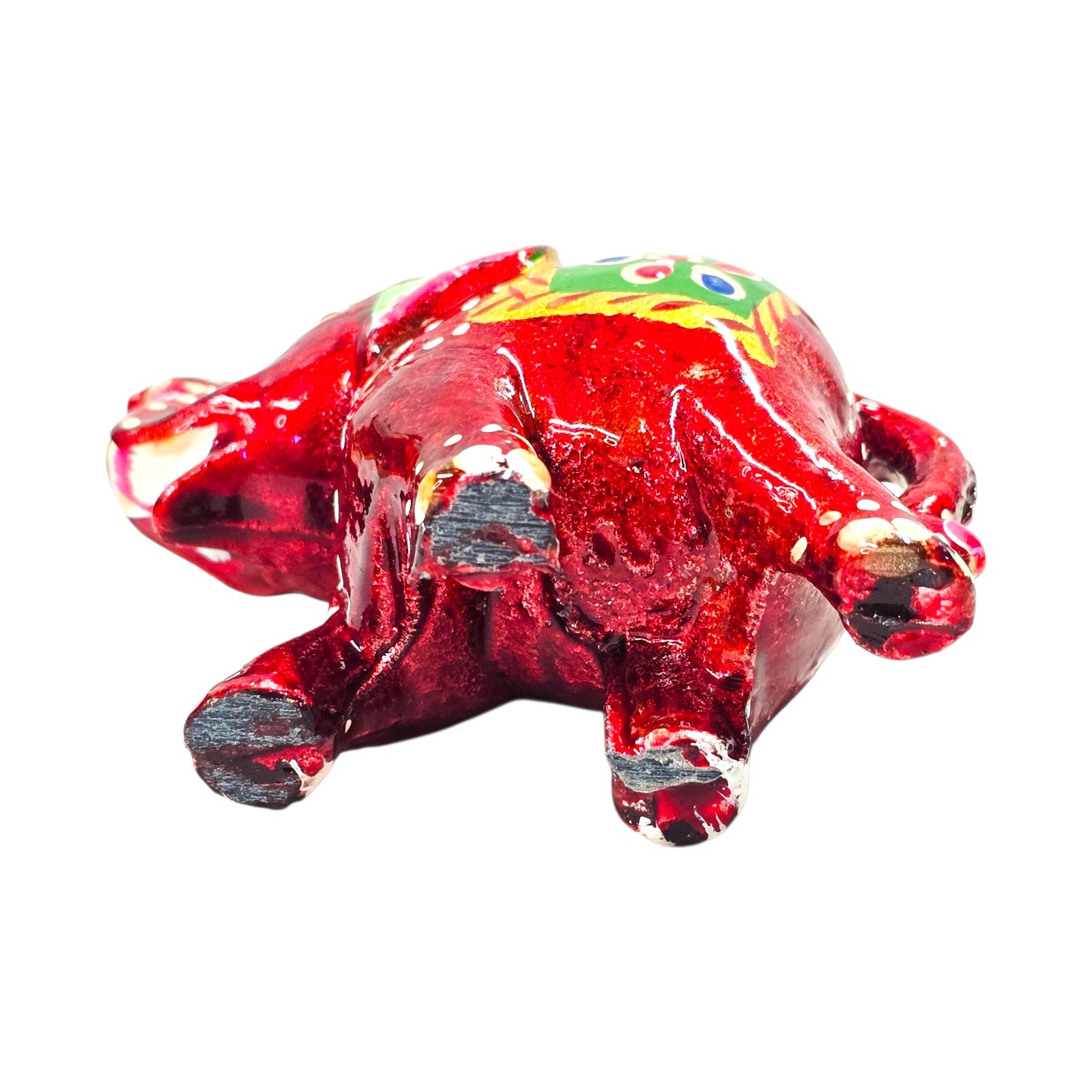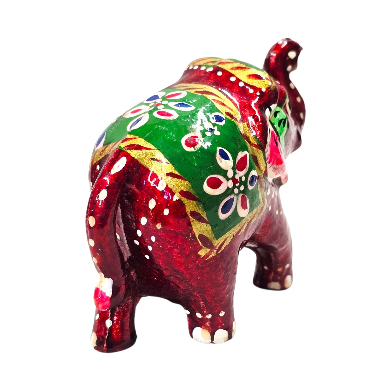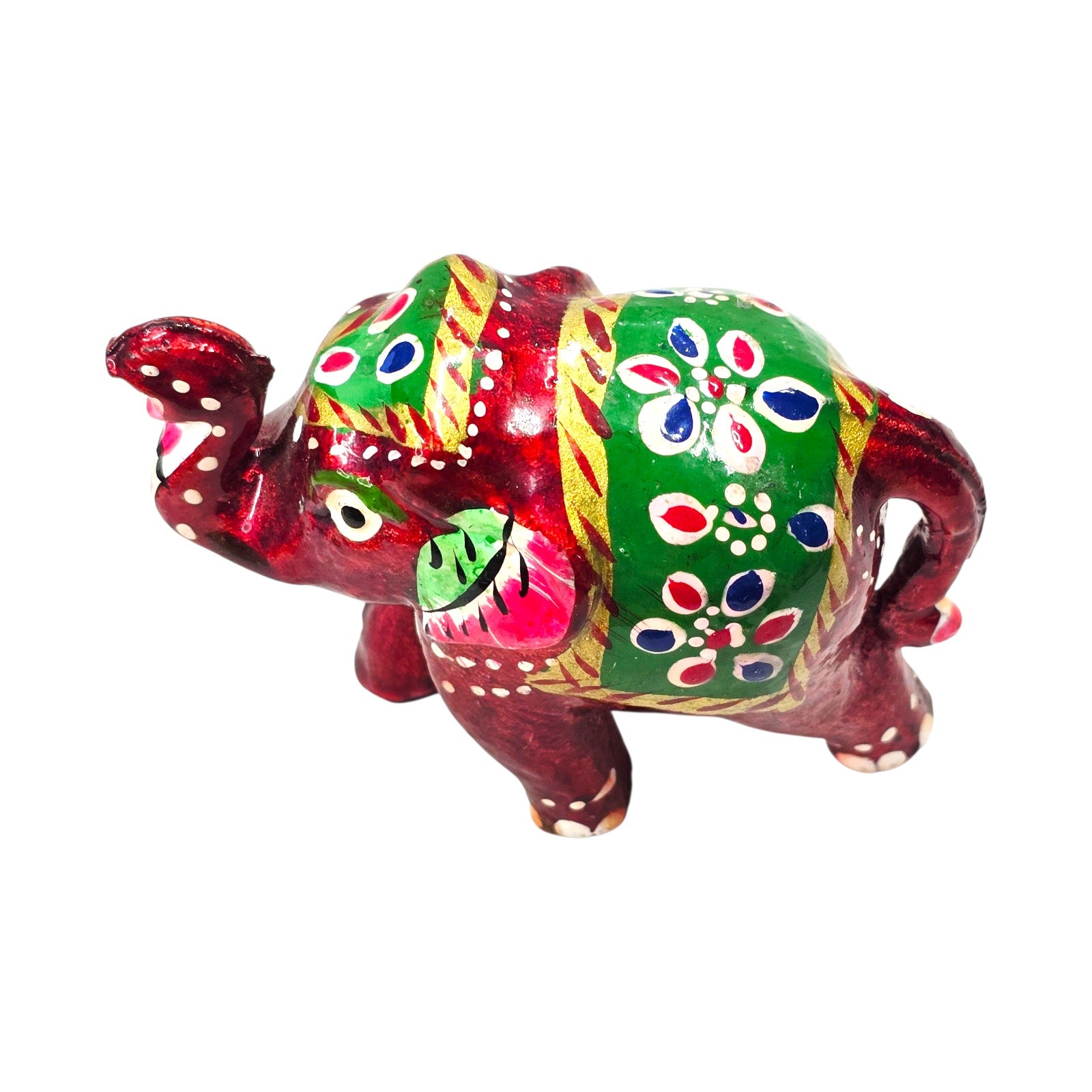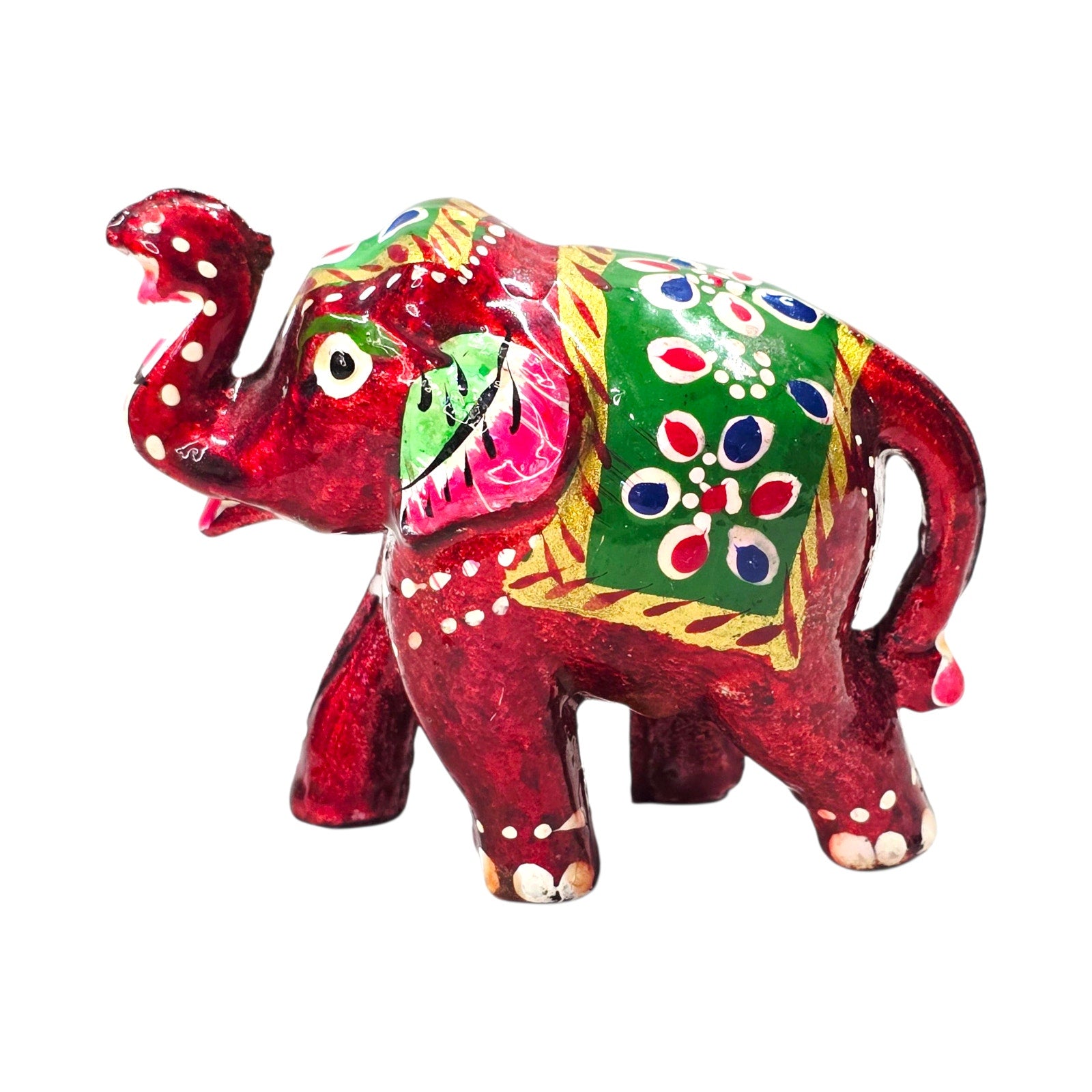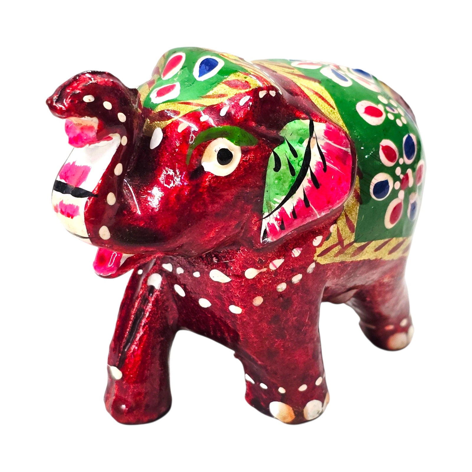 Small hand-painted elephant figurine in vibrant red with green and gold details. Folk art style, made in India. Decorative accent.