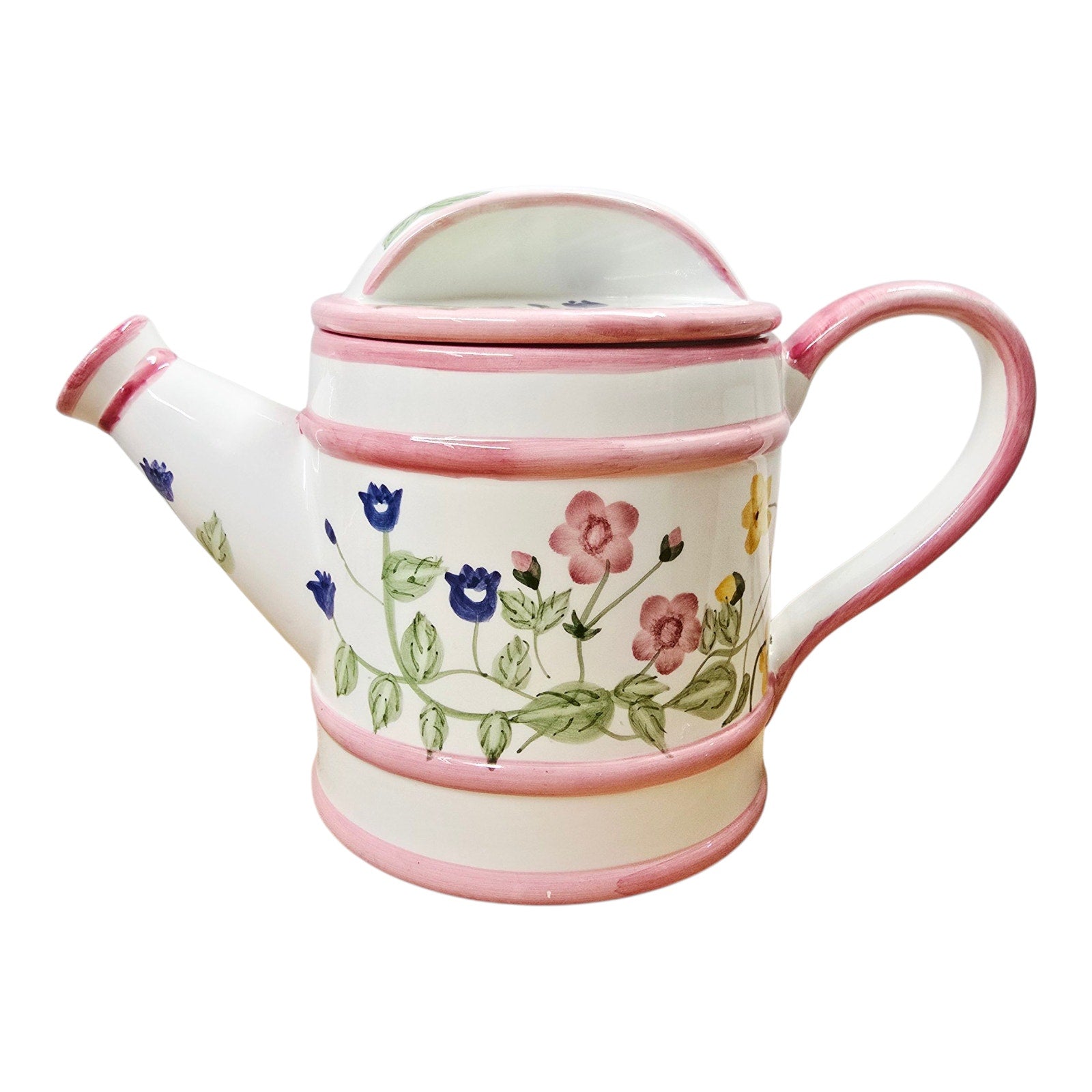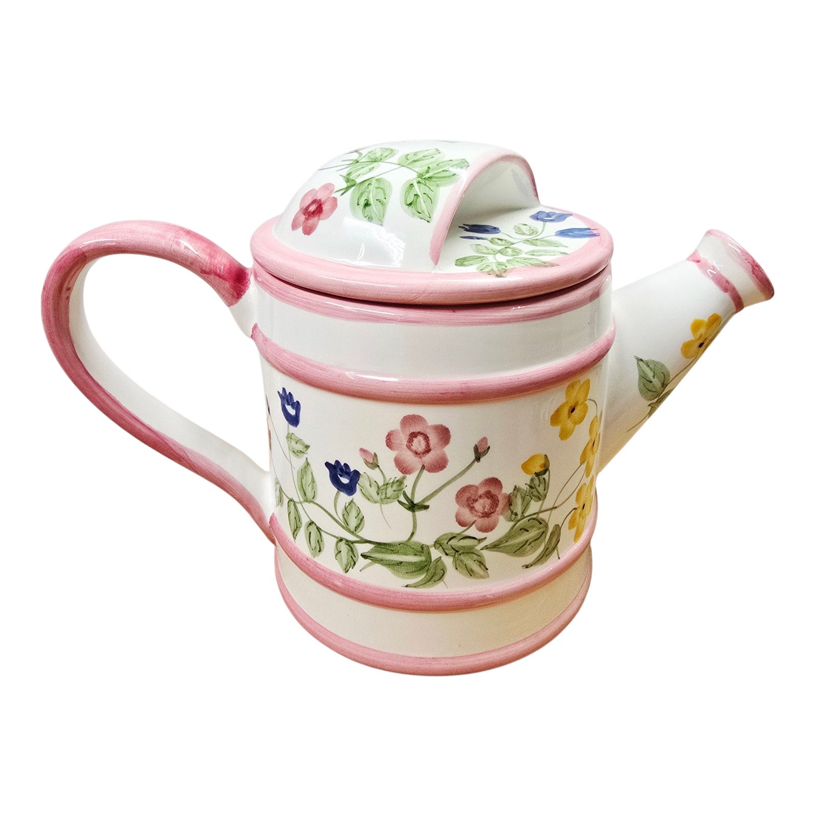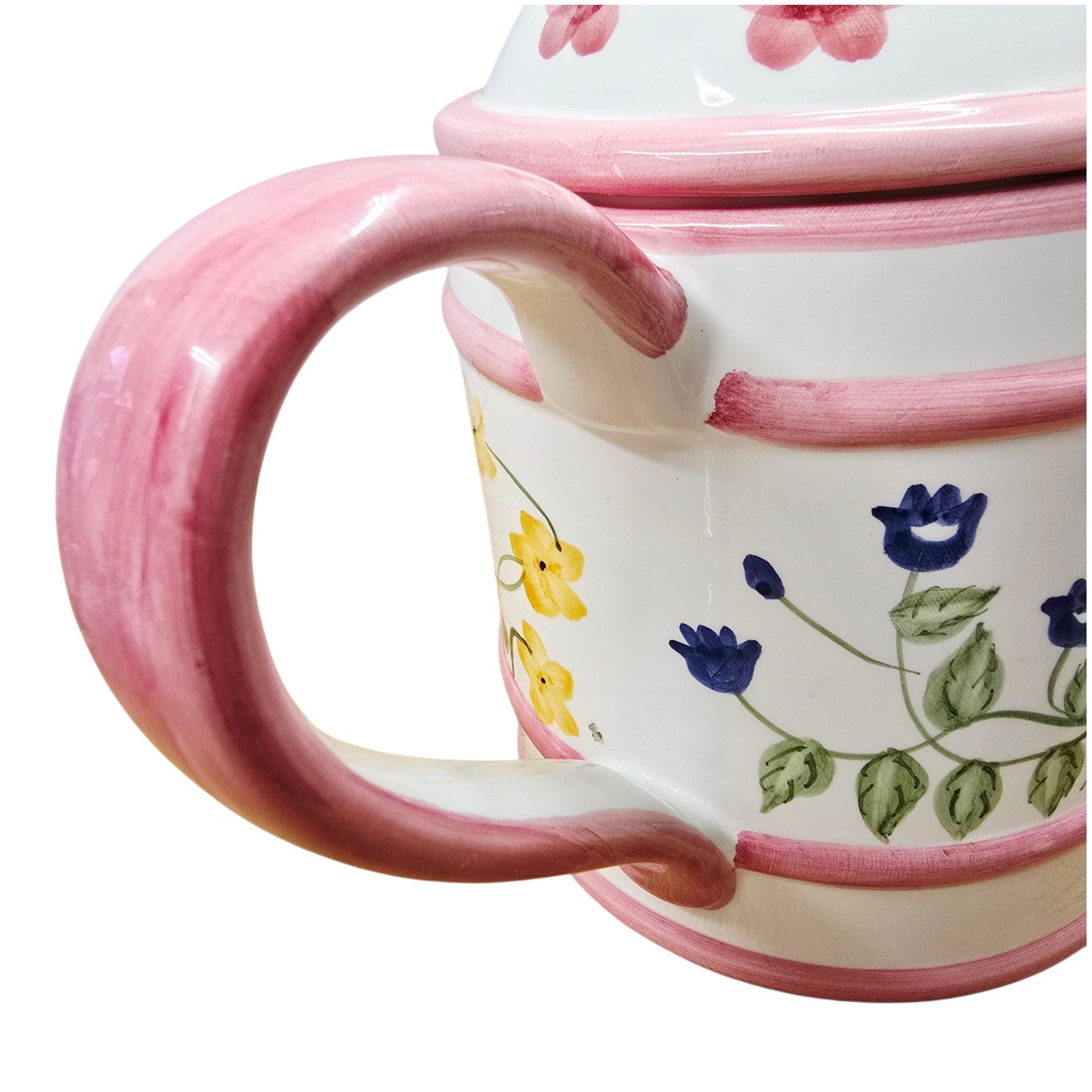 This vintage Lillian Vernon watering can/teapot features delicate hand-painted pink, yellow, and blue flowers.