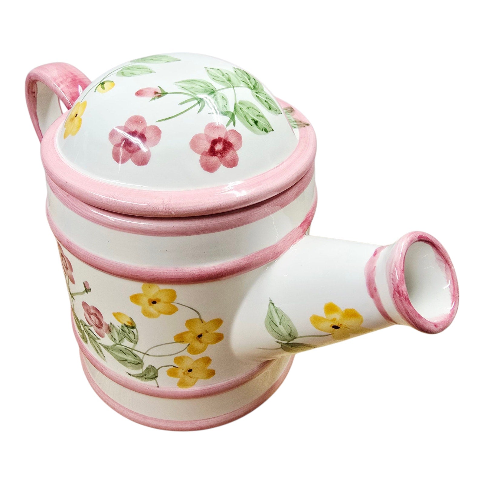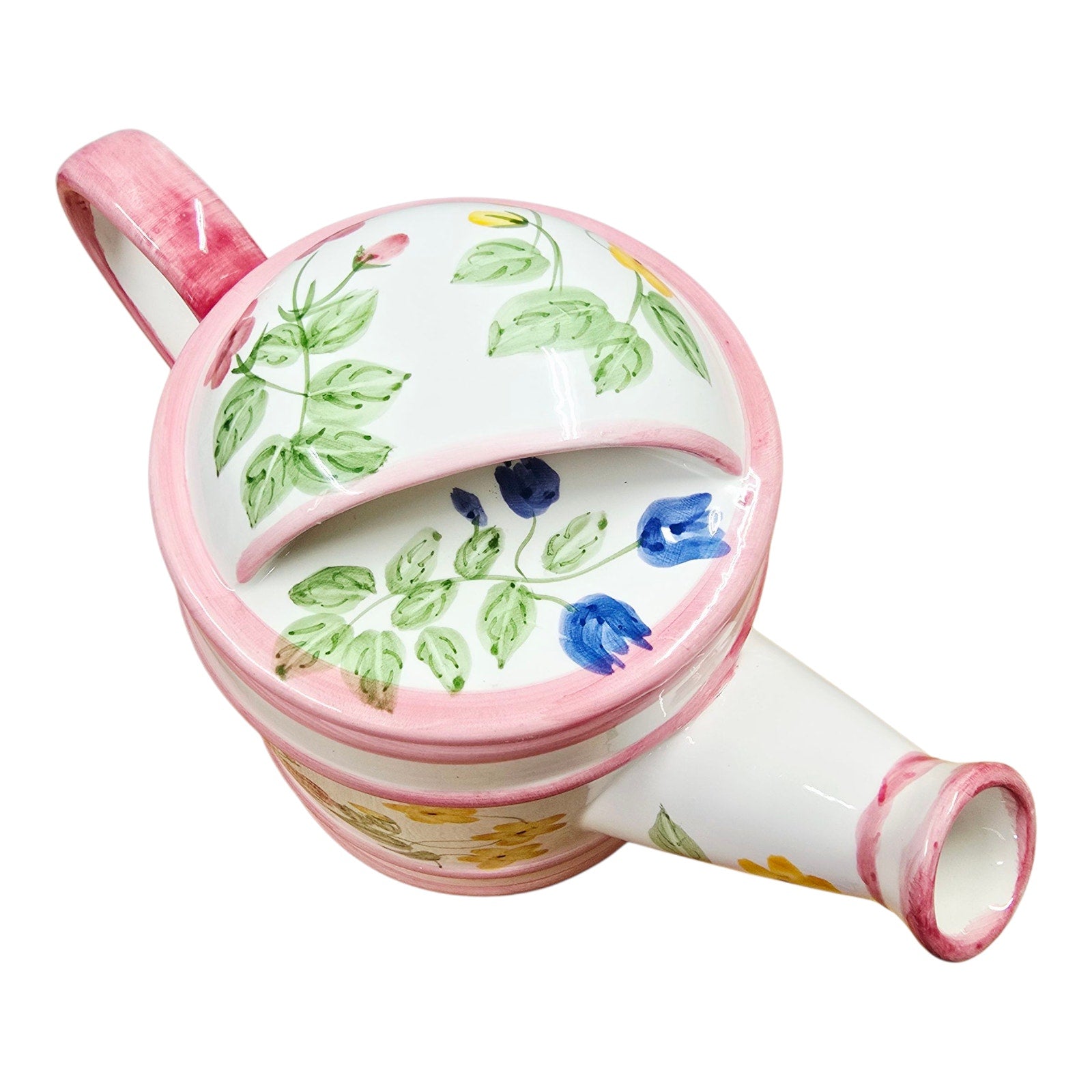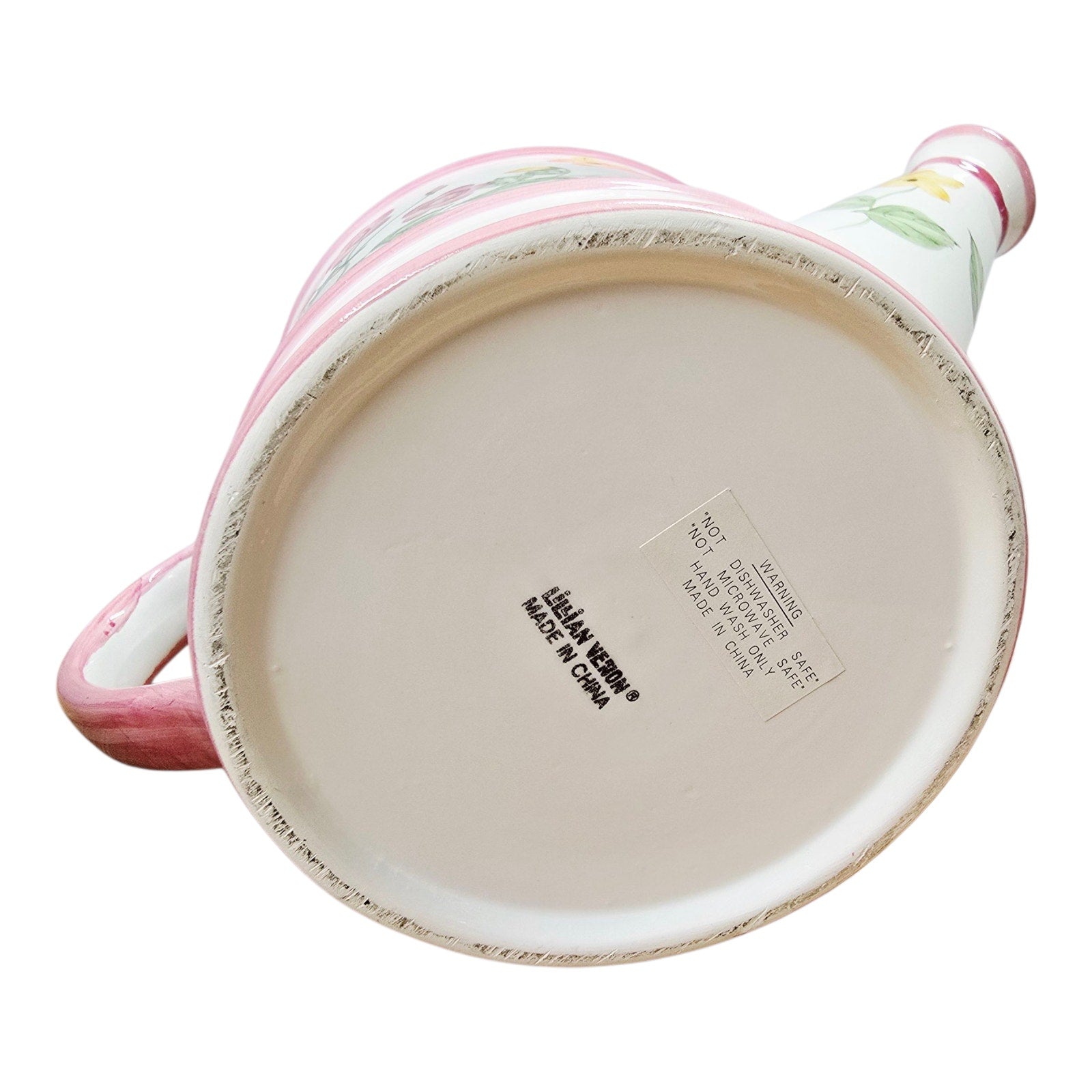 This vintage Lillian Vernon watering can/teapot features delicate hand-painted pink, yellow, and blue flowers.