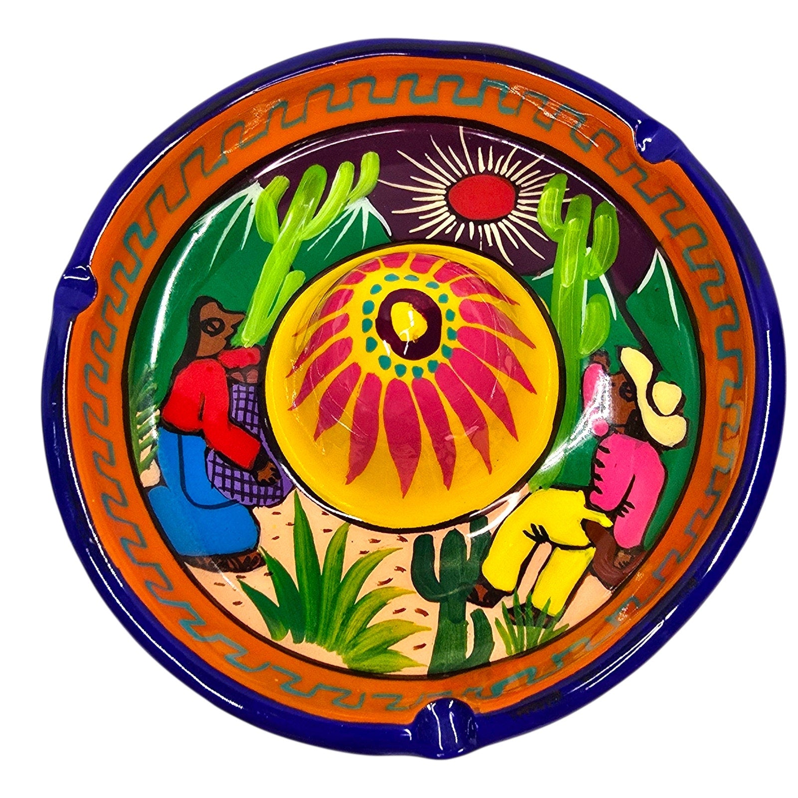 Vintage Mexican pottery ashtray shaped like a sombrero, featuring a vibrant hand-painted desert scene with figures, cacti, and a bright sun. Signed “MEX.” on base, likely Tonalá region. Perfect for display, boho decor, or folk art collection.