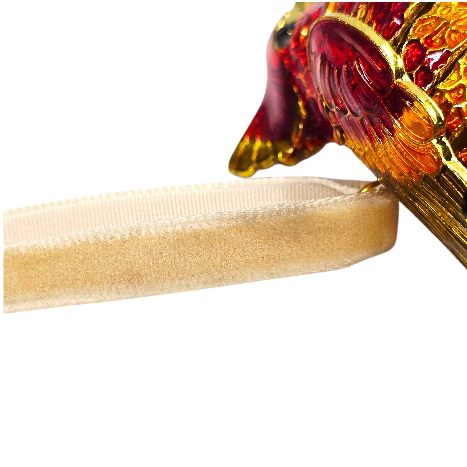 Beautiful red and gold cloisonné-style enamel bird ornament with gold-tone metal detailing and velvet ribbon for hanging. Original Pier 1 Imports box included. Measures about 3.5″ H × 5″ L. Perfect as a Christmas tree ornament or elegant gift.