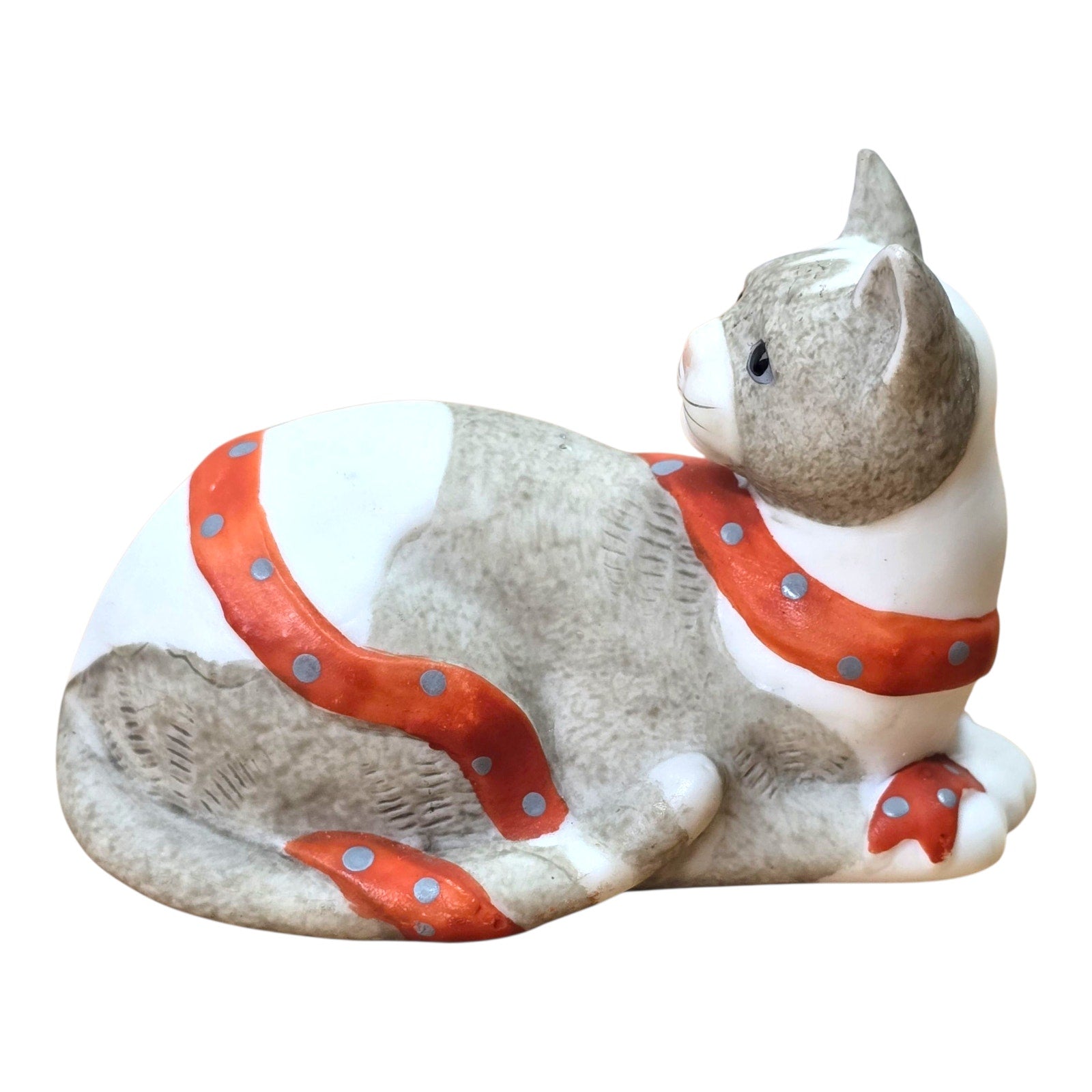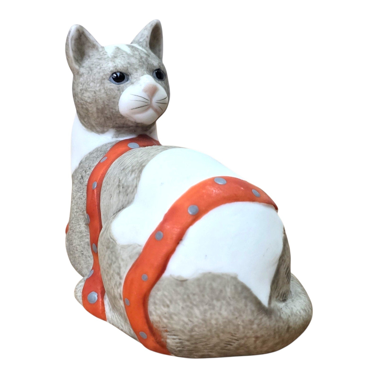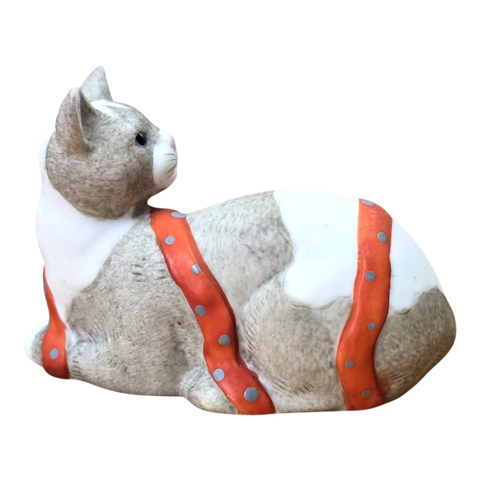 Vtg Silvestri Cat Figurine Handcrafted Taiwan Ceramic Gray White Orange Ribbon