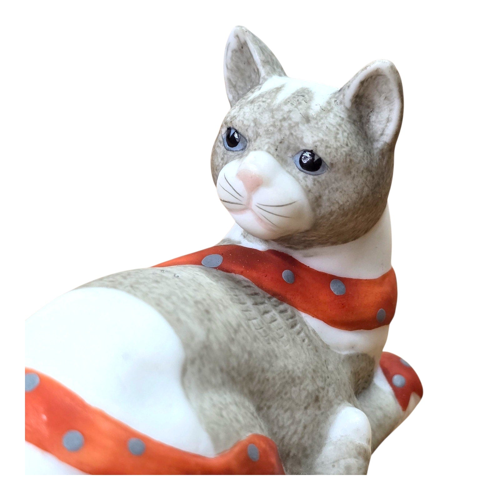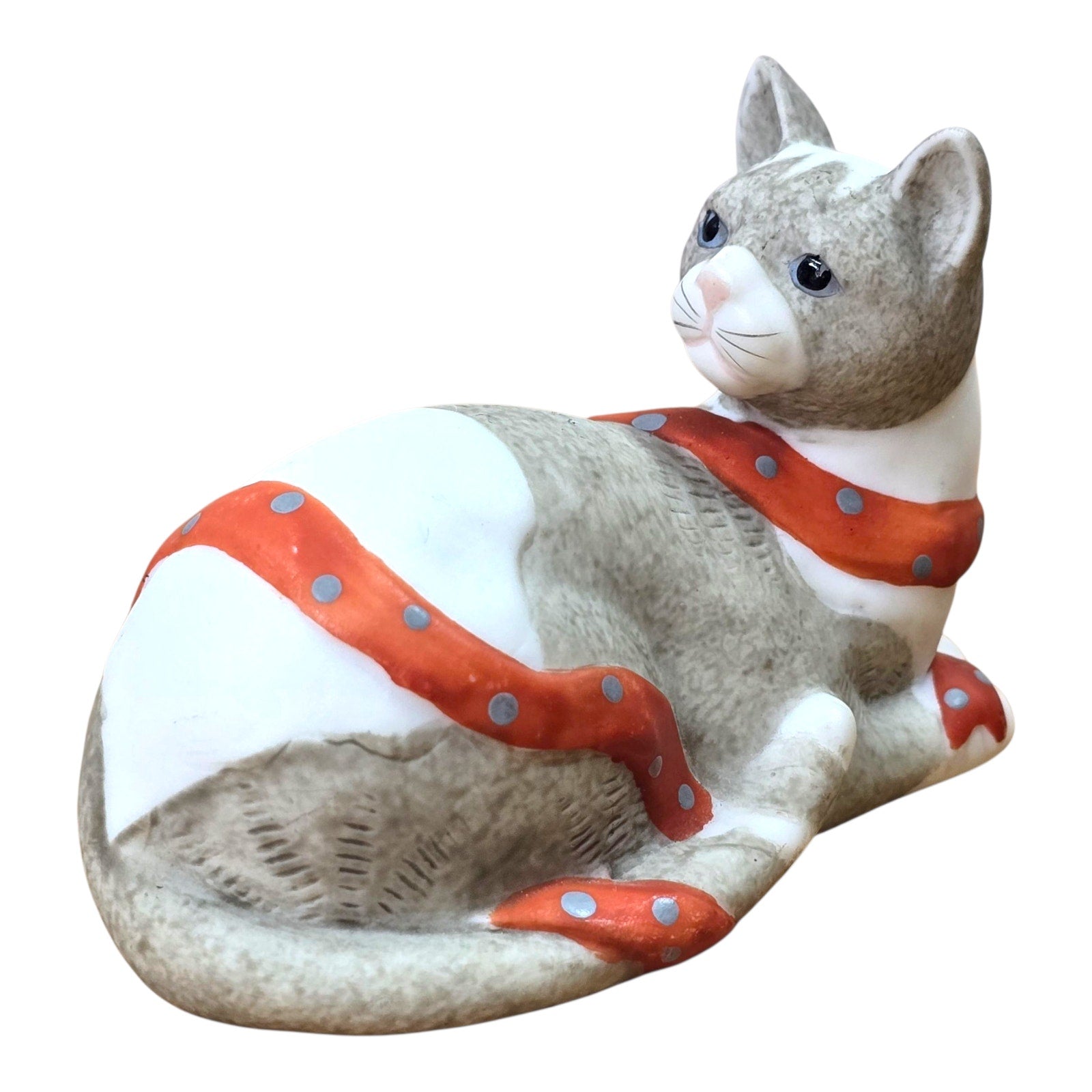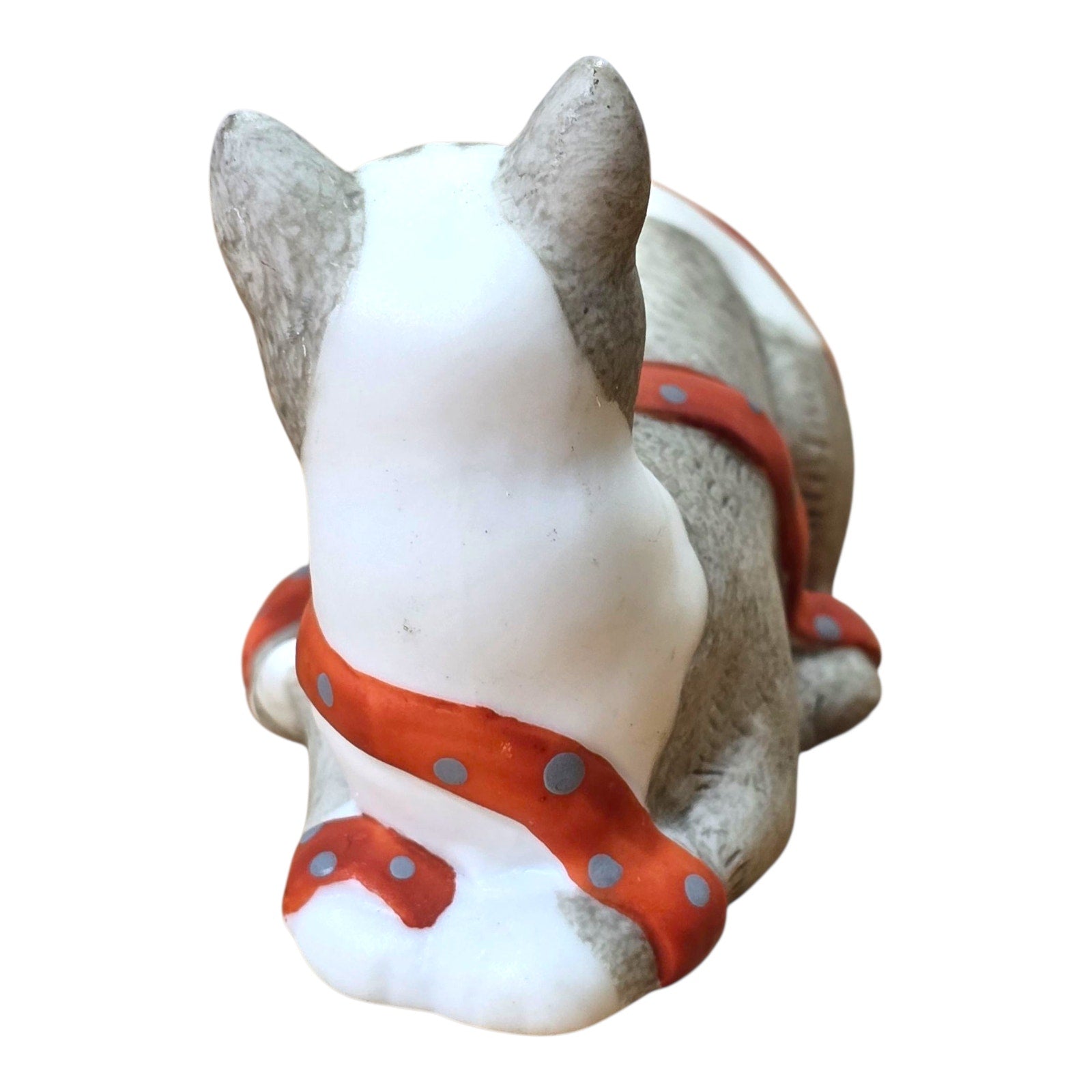 Vtg Silvestri Cat Figurine Handcrafted Taiwan Ceramic Gray White Orange Ribbon