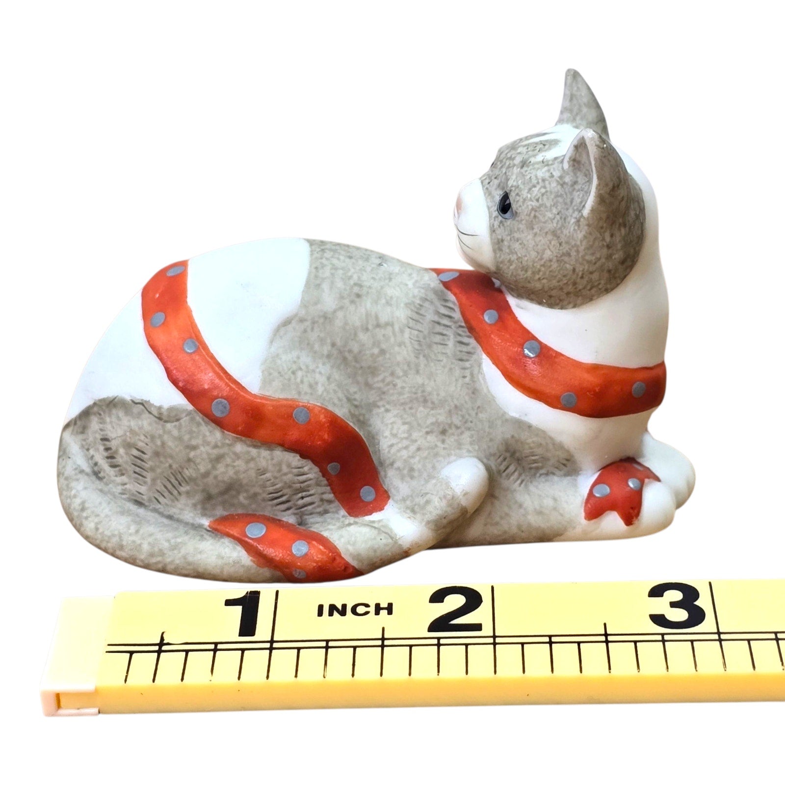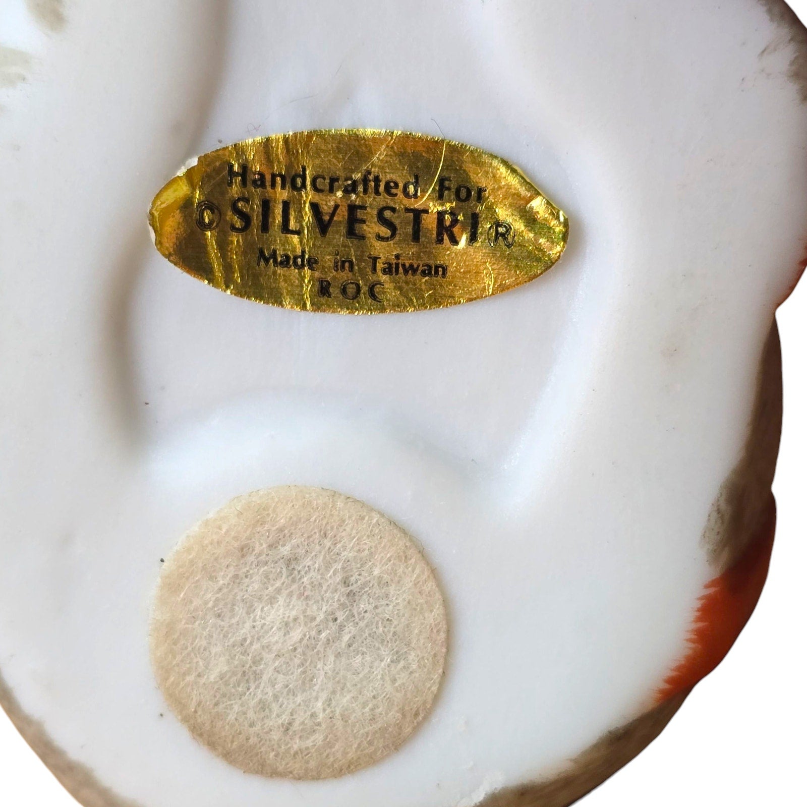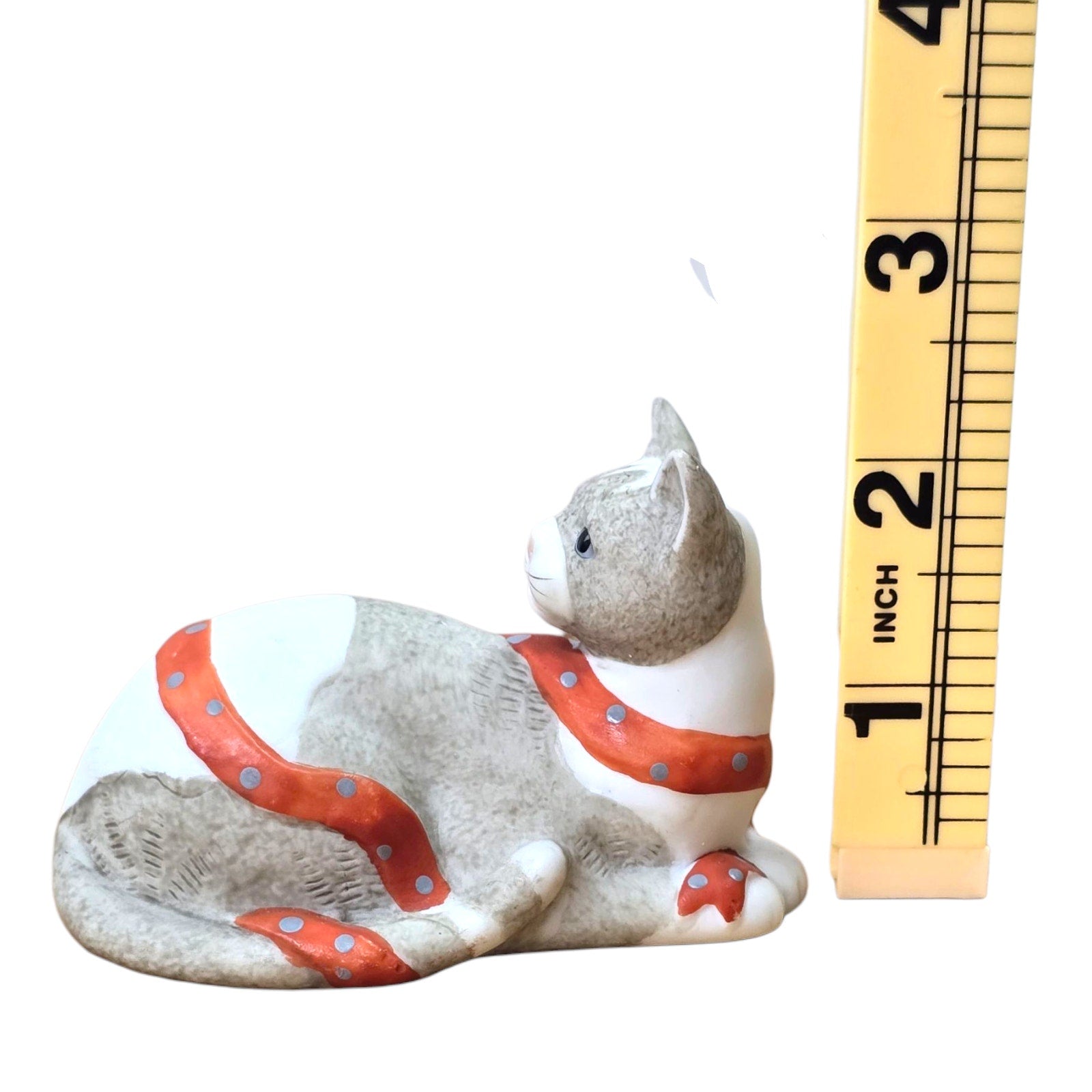 Vintage Silvestri ceramic cat figurine, approx. 3.25"W x 2.5"H. Features gray and white body with painted orange polka-dot ribbon detail. Retains original gold Silvestri label marked “Handcrafted for Silvestri, Made in Taiwan ROC.”