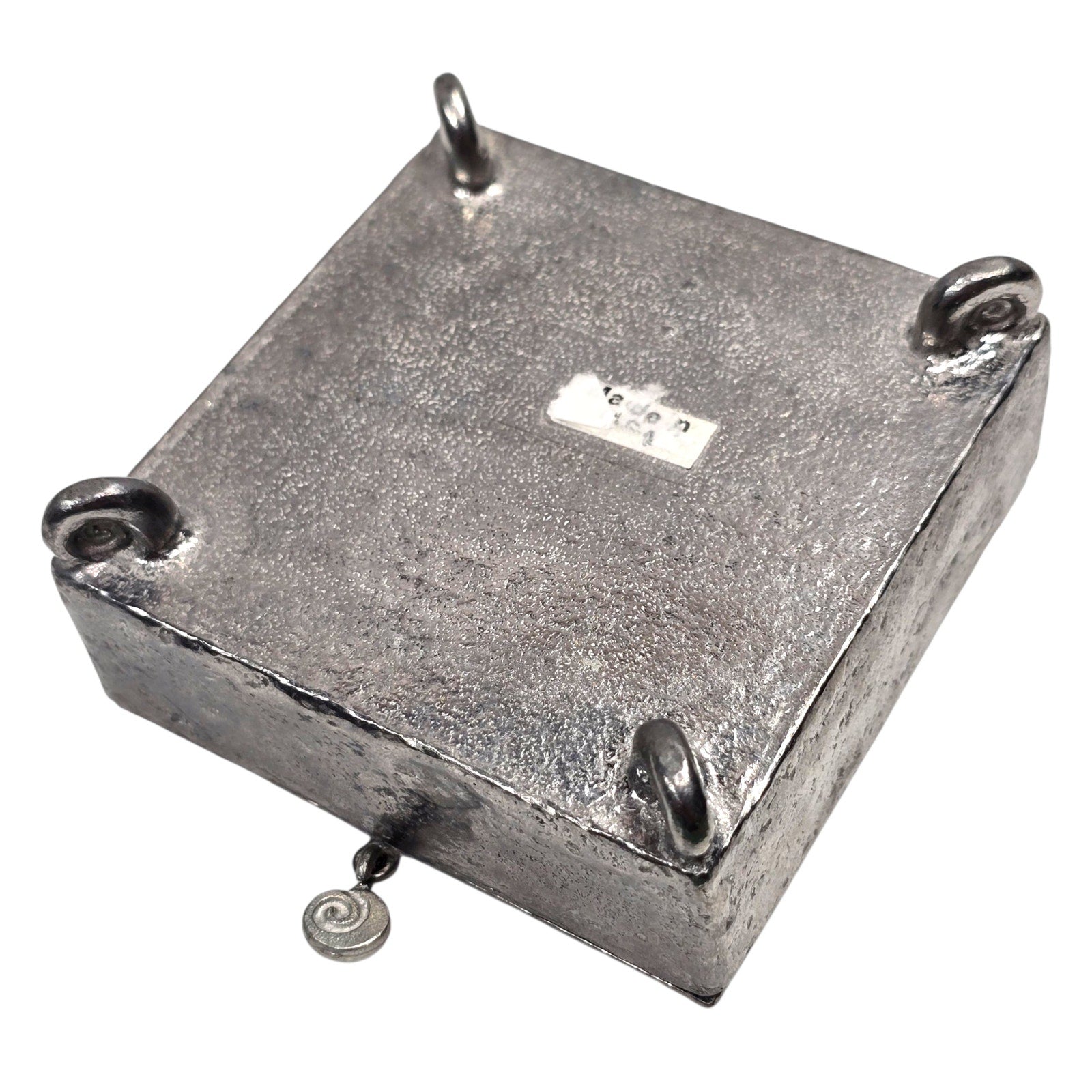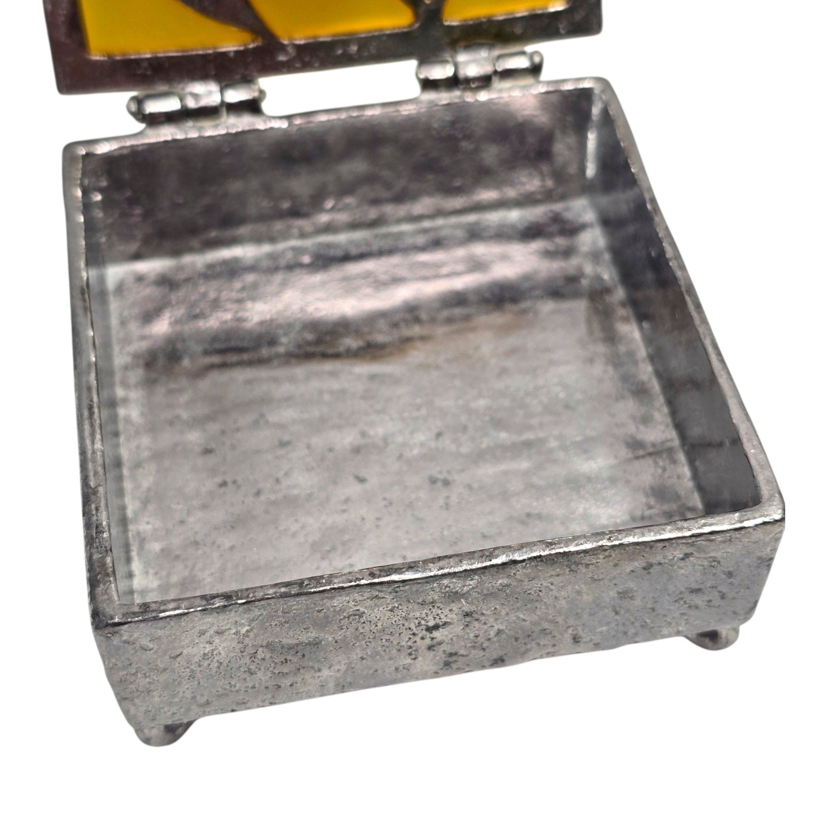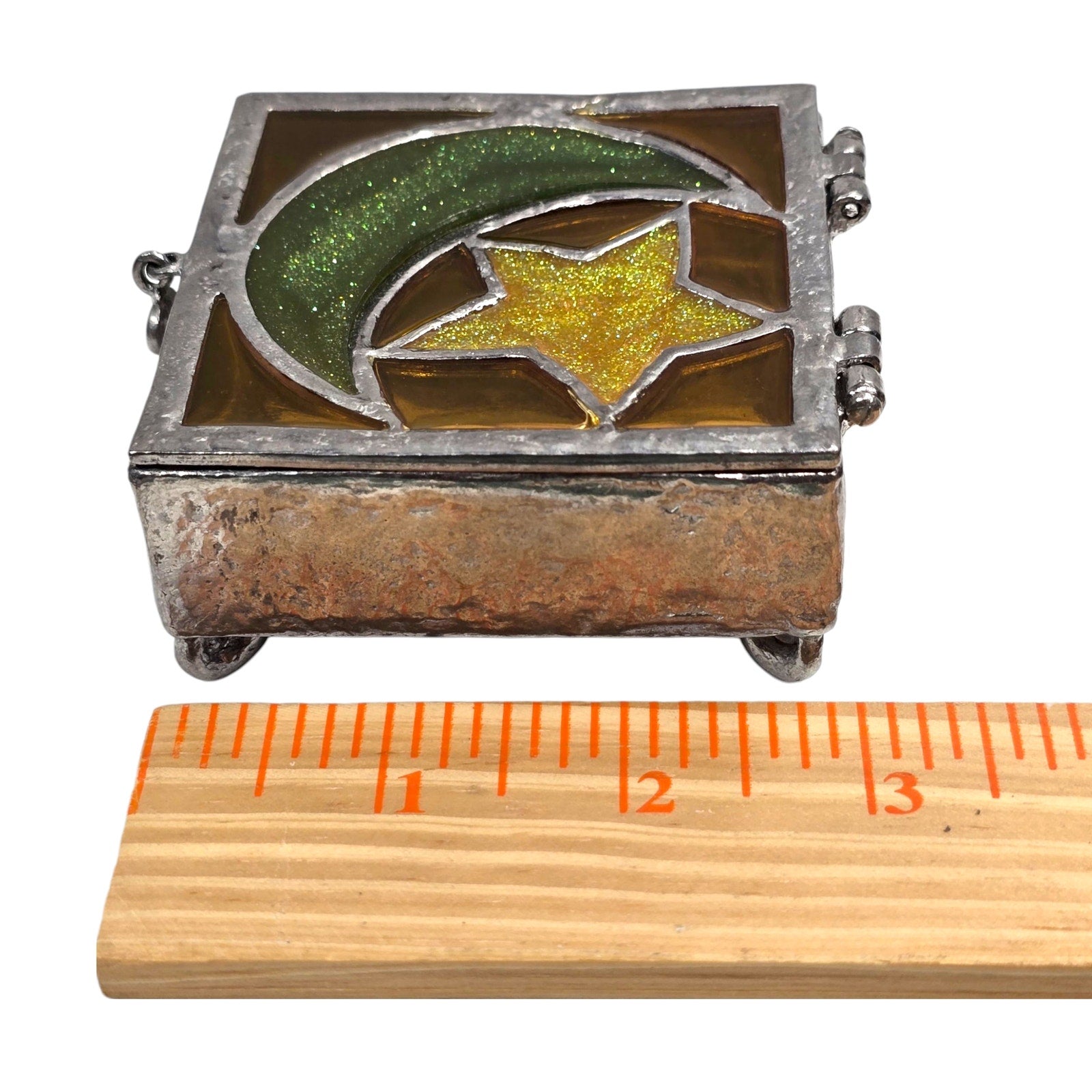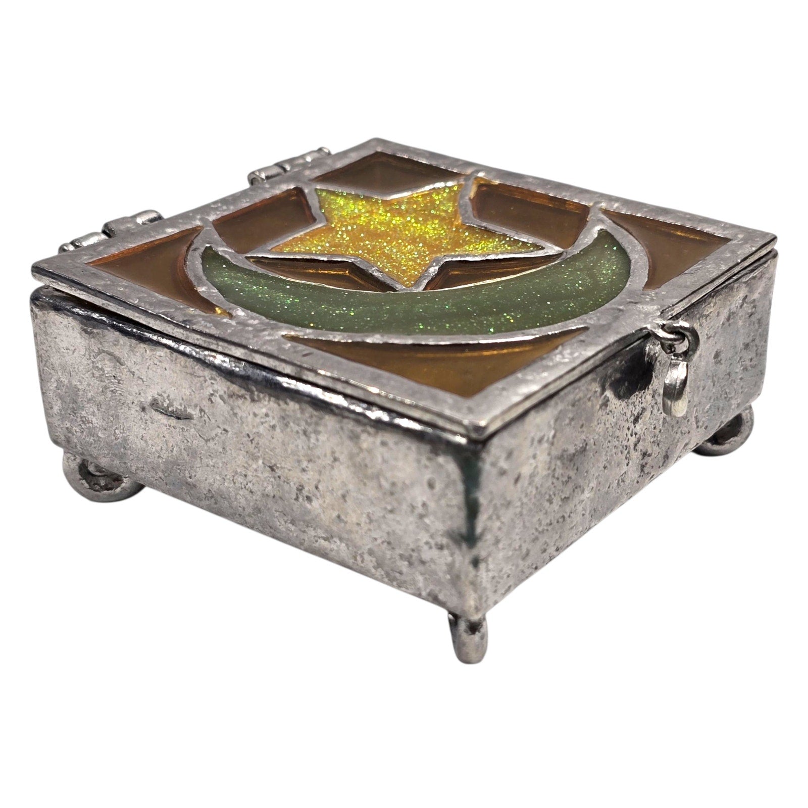Beautiful handmade stained glass trinket box featuring a glittery green crescent moon and golden star set in warm amber glass. Crafted with a pewter-tone soldered metal frame that gives a rich, old-world artisan look. Textured surface, spiral latch, and ball feet add charm. Marked “Made in USA” on base — perfect for jewelry, keepsakes, or celestial home decor.
