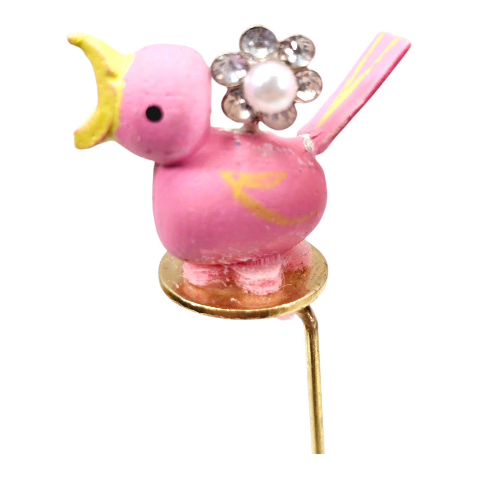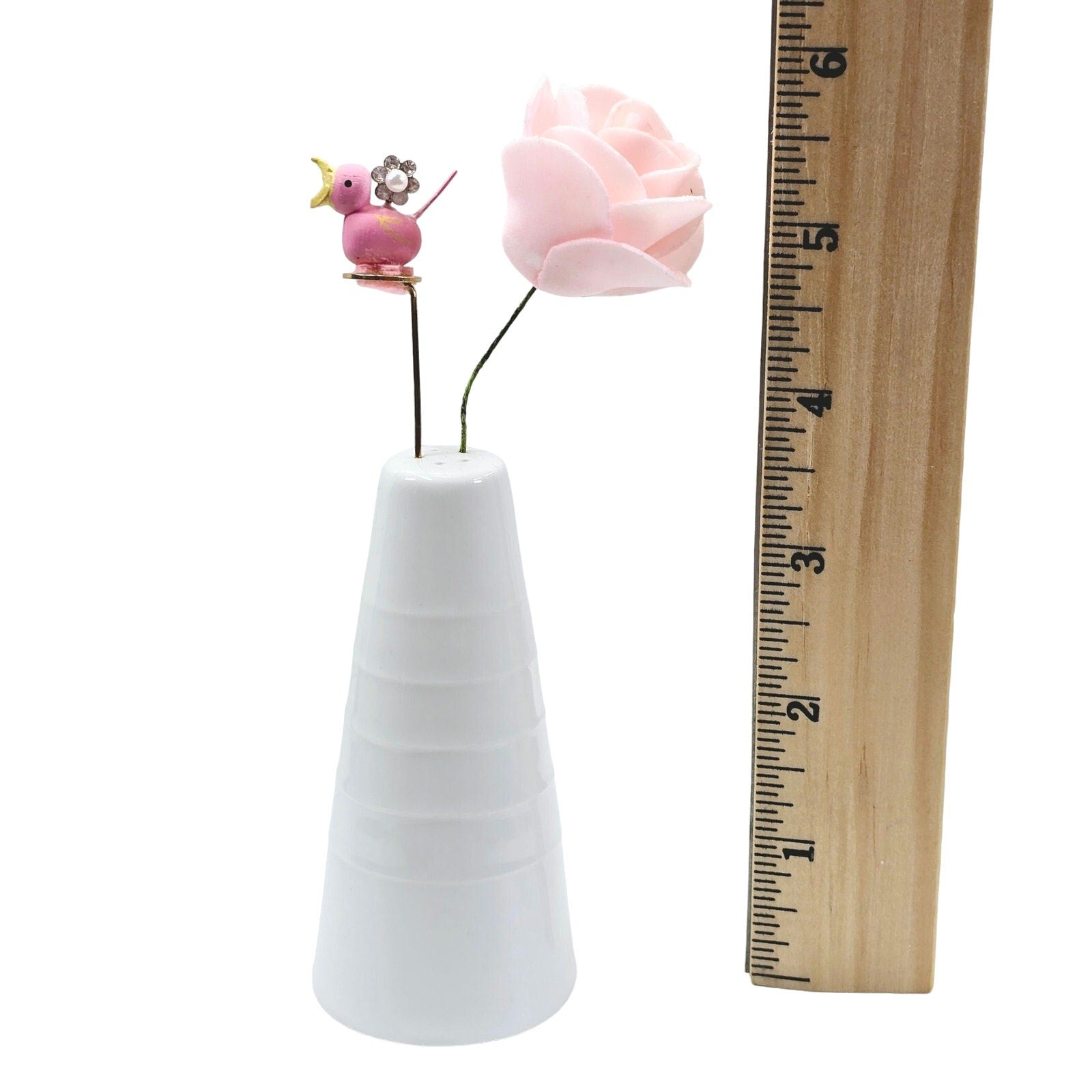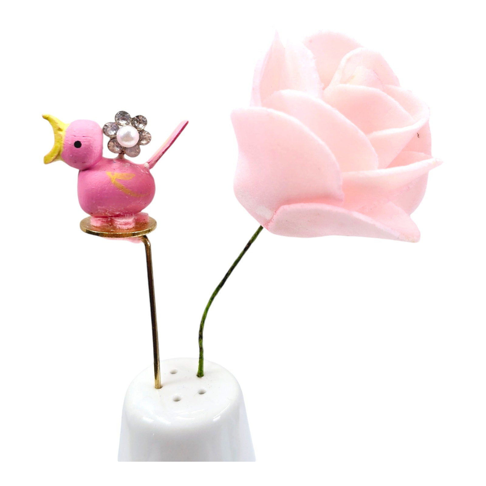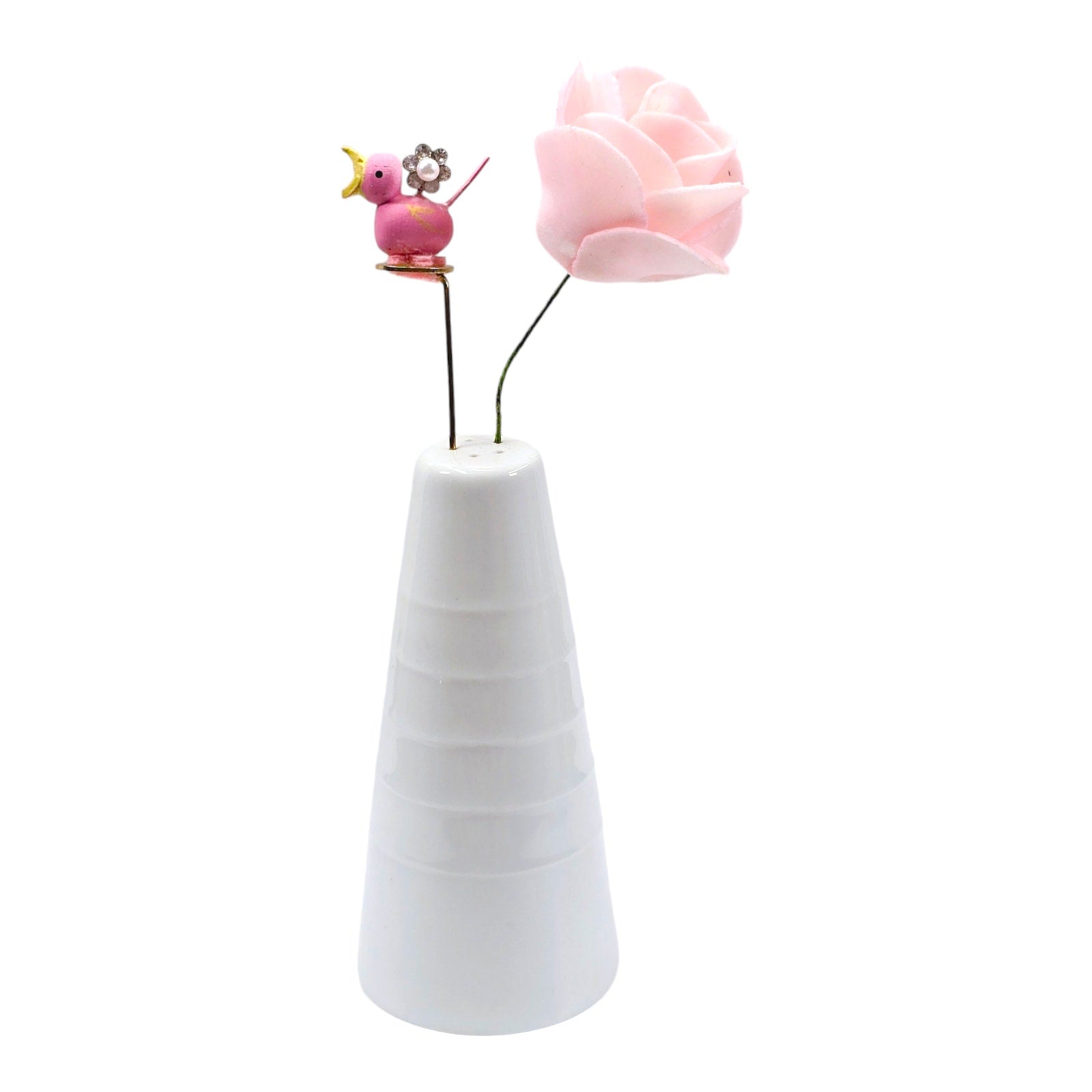 White Salt Shaker Display with Pink Bird and Pink Rose