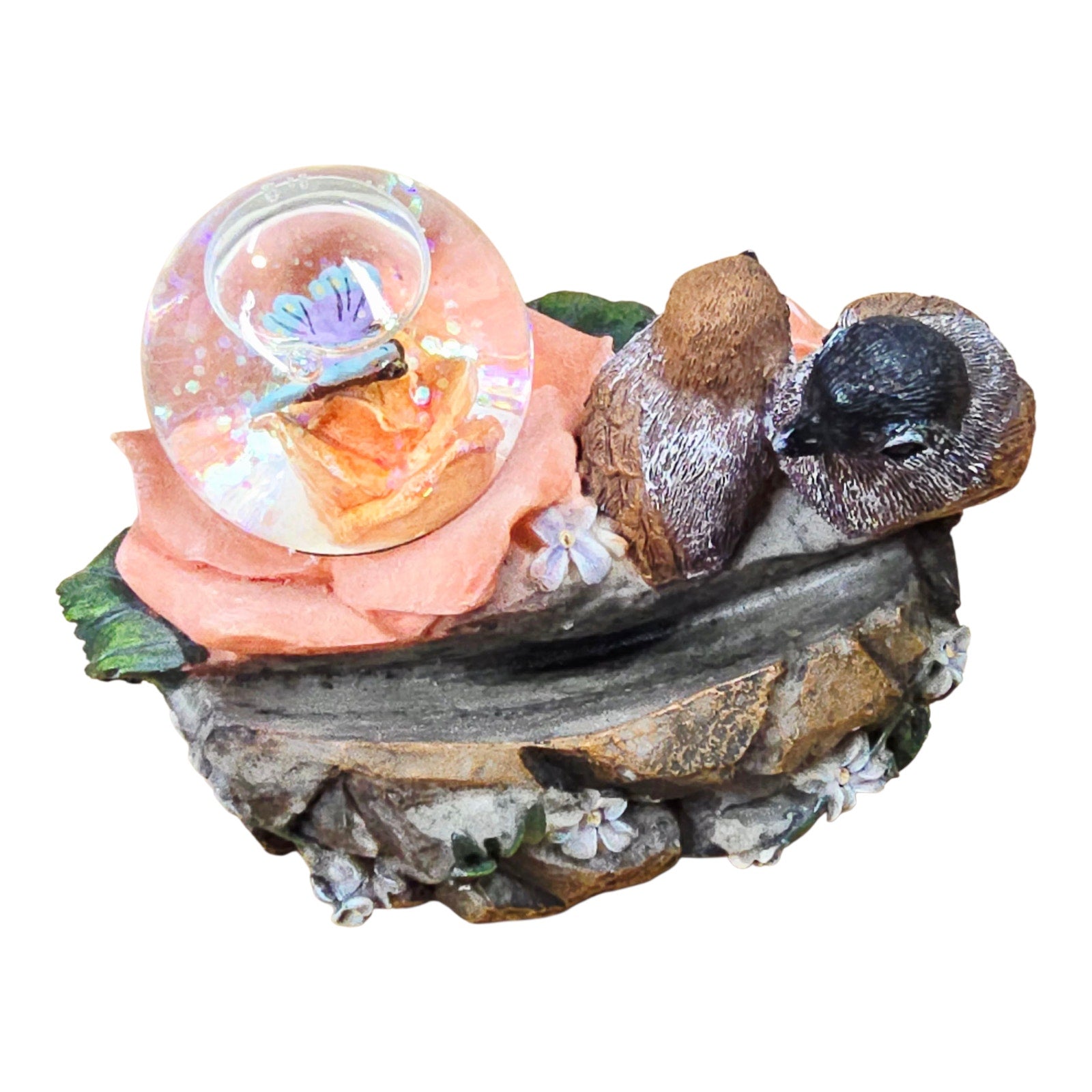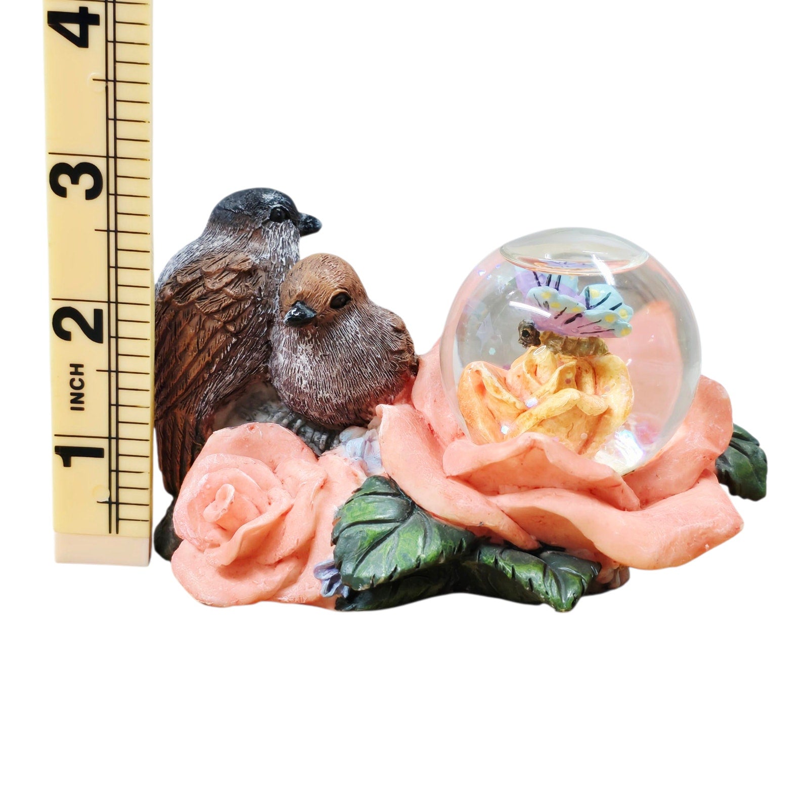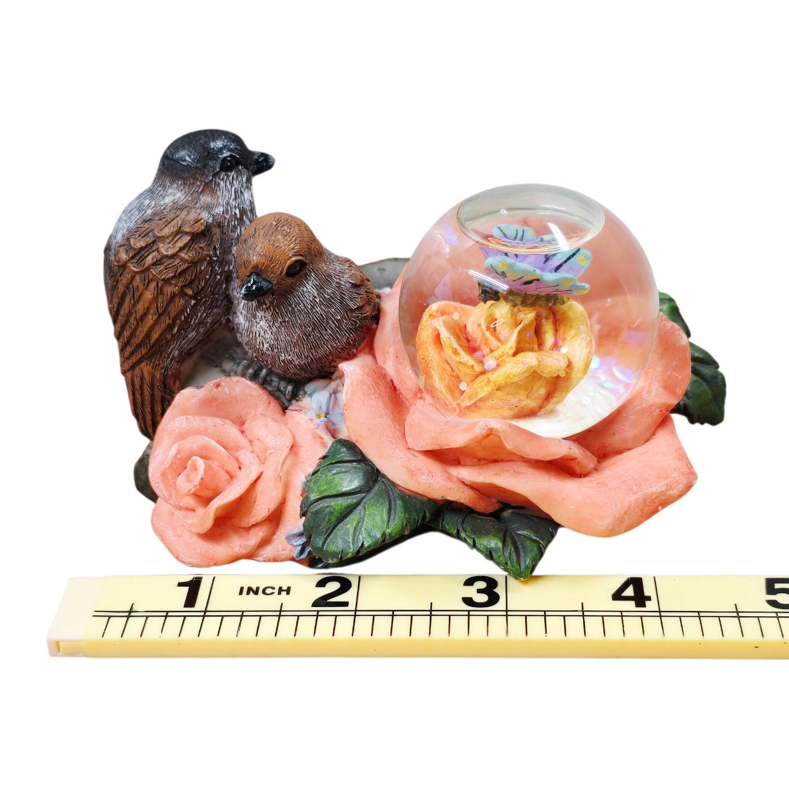 Young’s Inc. resin figurine featuring two birds perched among roses with an attached mini snow globe containing a fairy on a flower. Measures approx. 4.5" wide x 2.75" high. Decorative collectible for bird, floral, or fairy lovers.