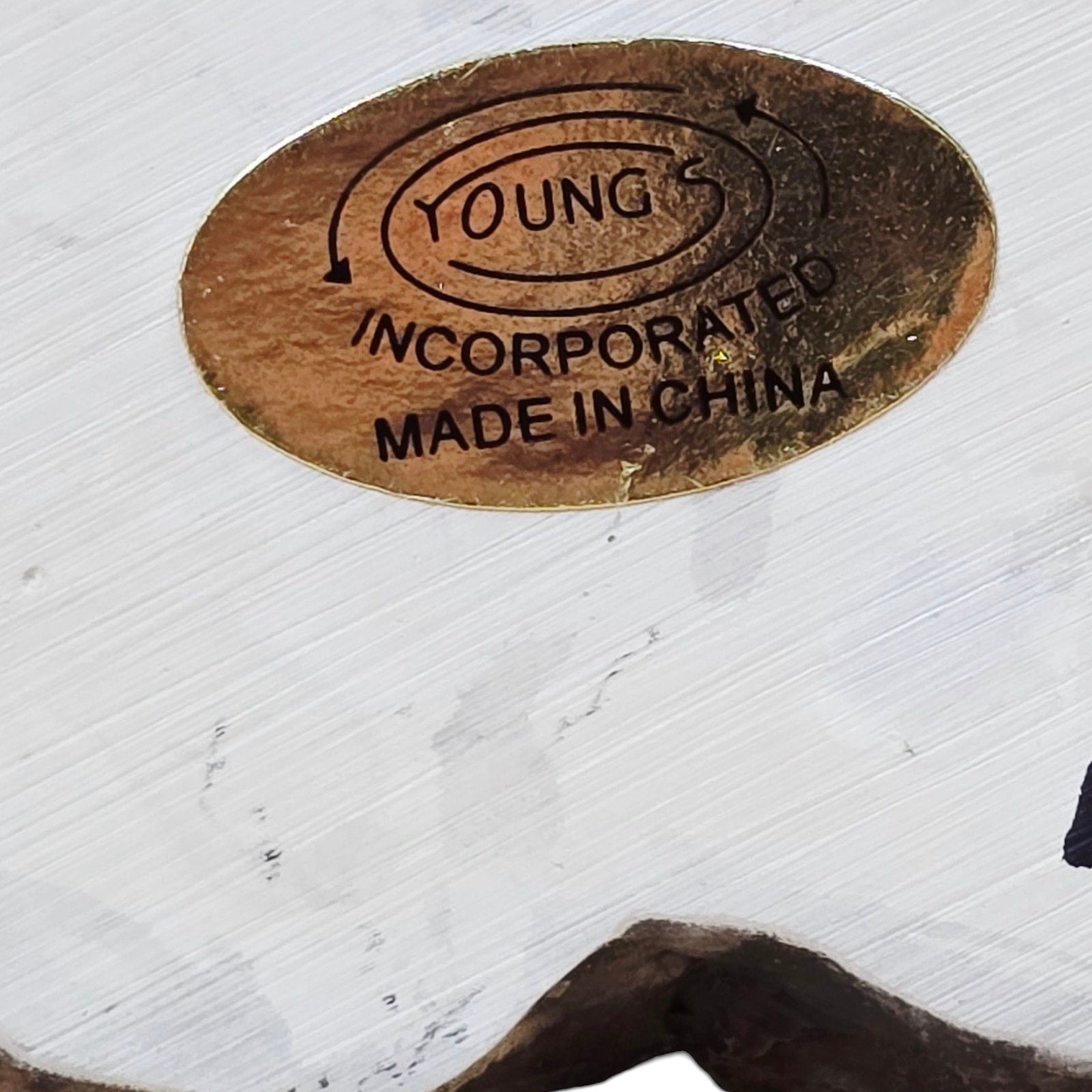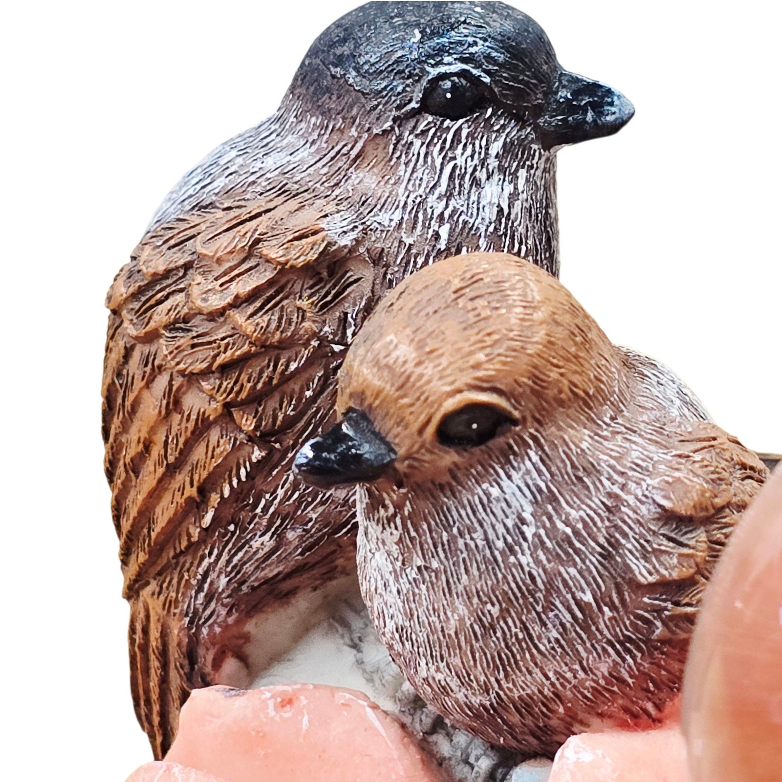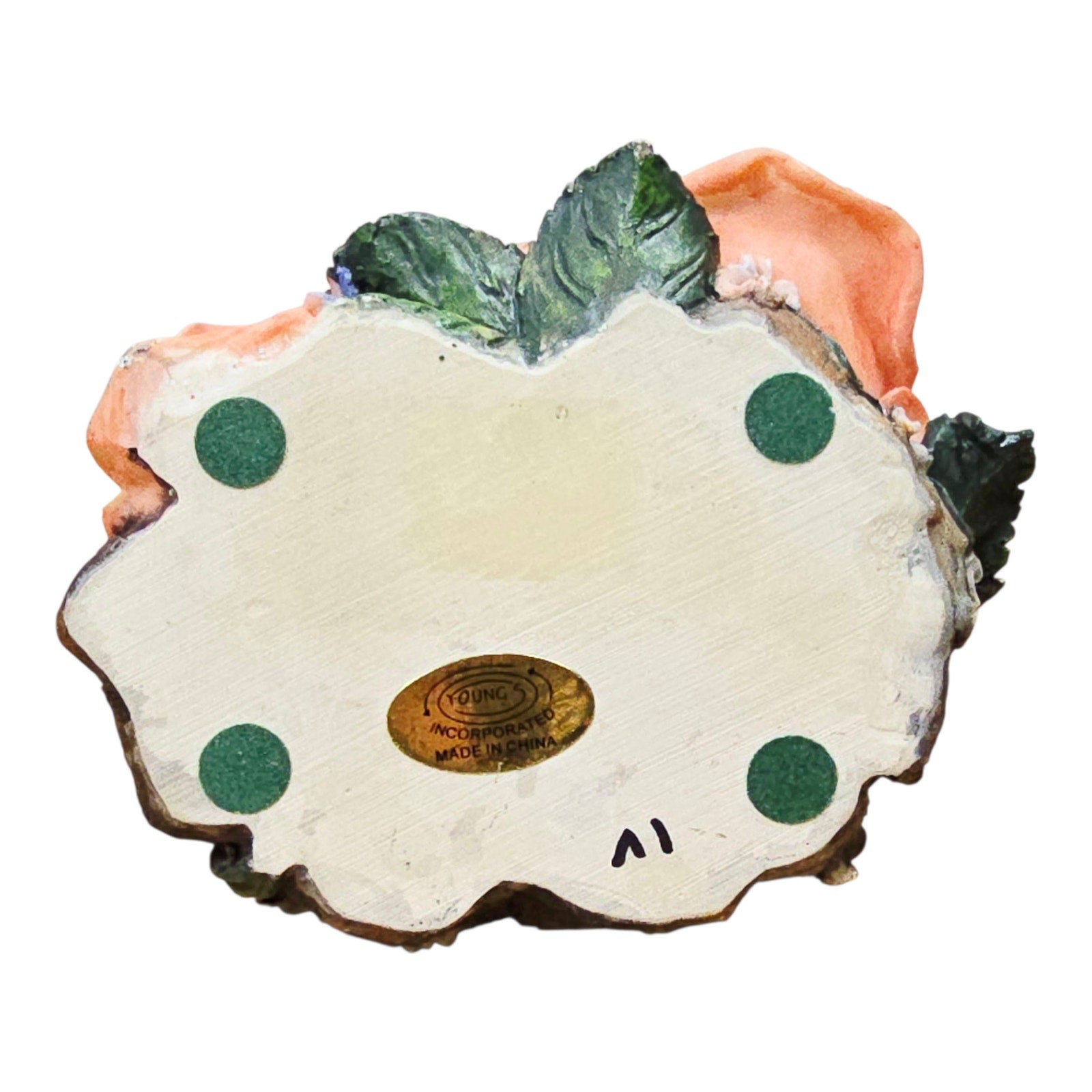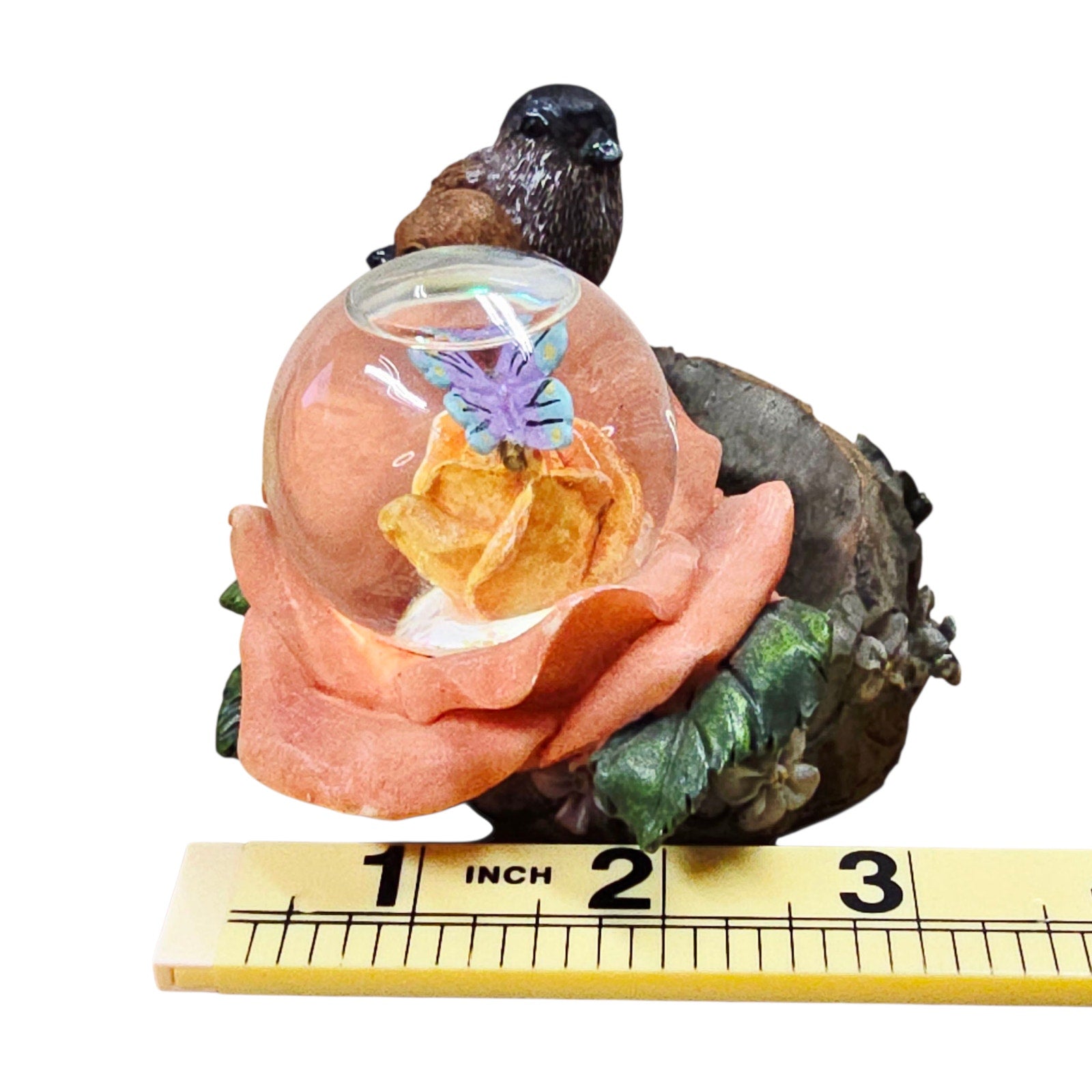 Young’s Inc. resin figurine featuring two birds perched among roses with an attached mini snow globe containing a fairy on a flower. Measures approx. 4.5" wide x 2.75" high. Decorative collectible for bird, floral, or fairy lovers.